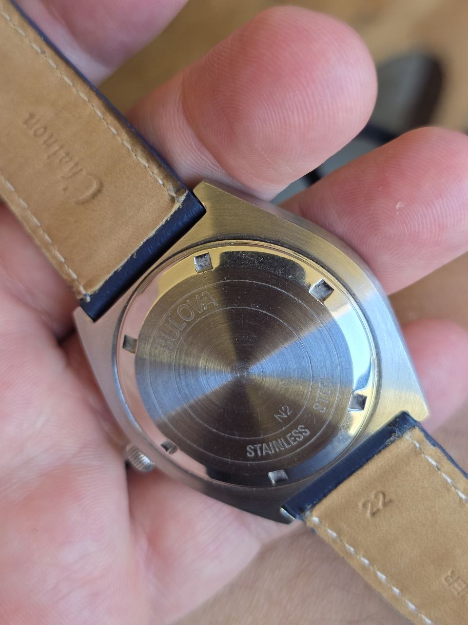 Relógio Bulova automático suíço vintage, peça de visual marcante e extremamente elegante, com design típico dos anos 70. Pelos códigos observados nas fotos, a produção é provavelmente de 1972/1973, com caixa marcada N2 e mecanismo marcado N3.