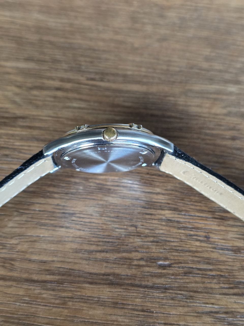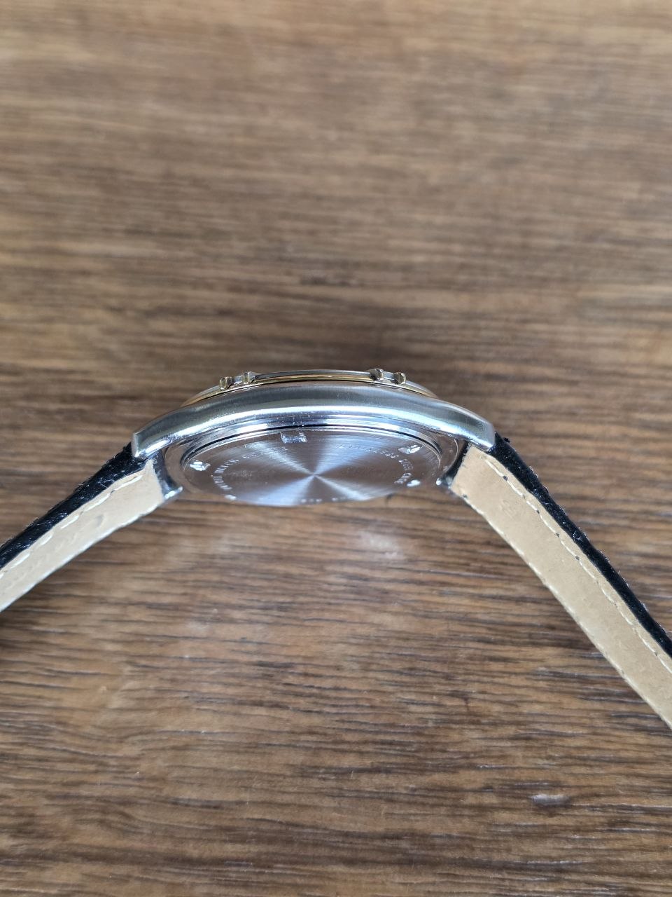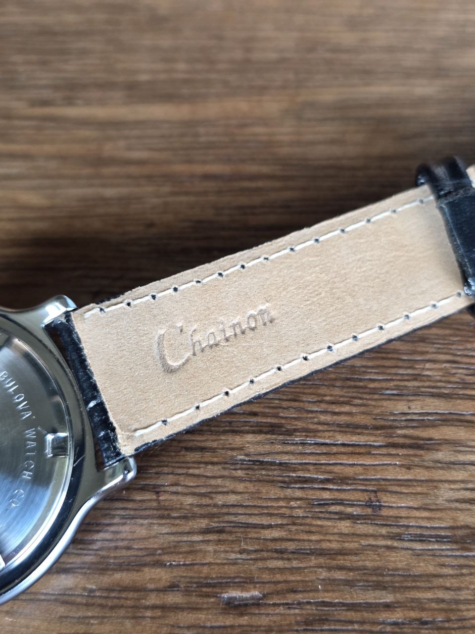 O relógio está com pulseira nova em couro bovino da marca Chainon, escolhida para harmonizar com o estilo clássico da peça.