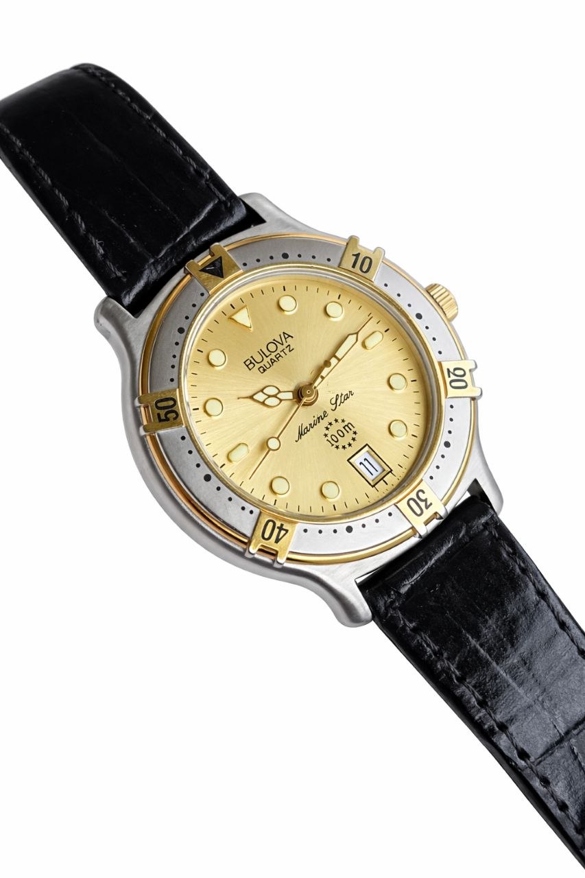 O relógio traz no mostrador a inscrição Bulova Quartz, Marine Star, 100m e T Swiss 90850T na posição das 6 horas.