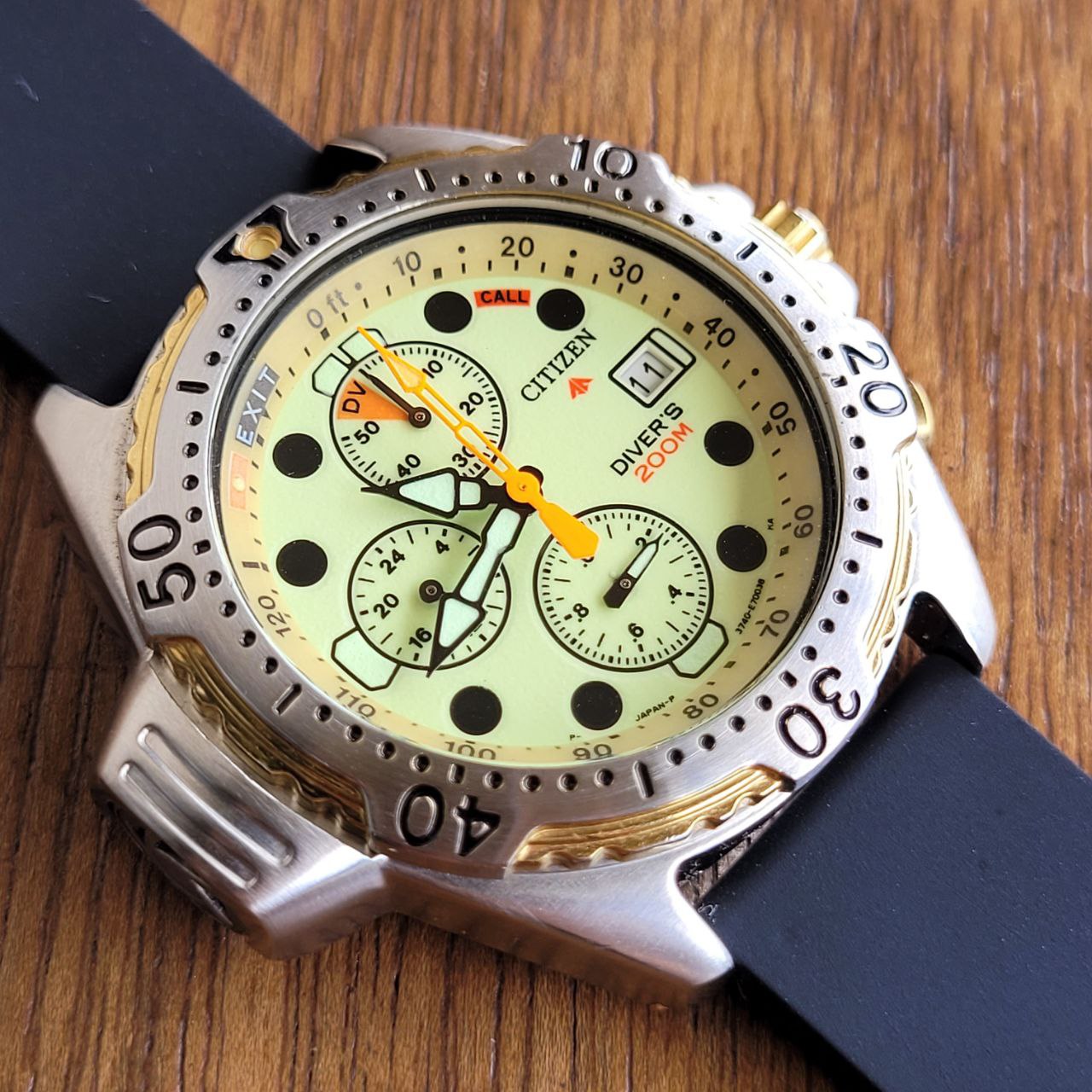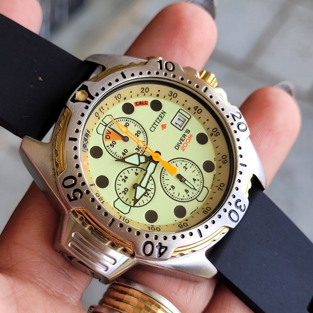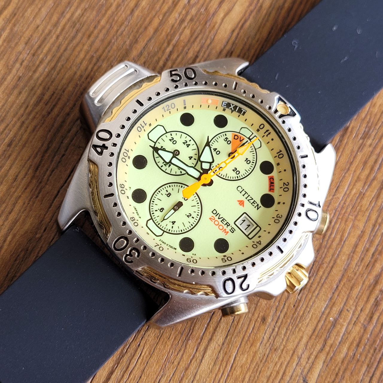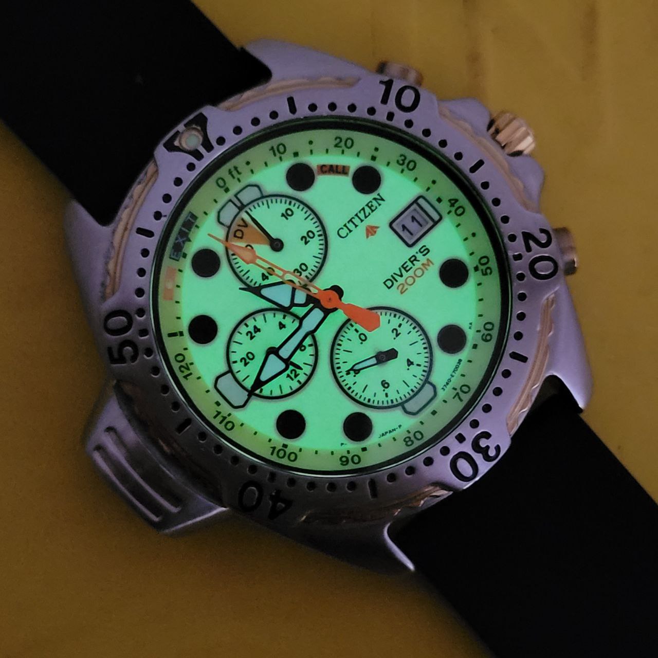 Relógio Citizen Aqualand Diver’s 200m, modelo clássico dos anos 90, com mostrador Full Lume em tom amarelo-esverdeado que brilha completamente no escuro.