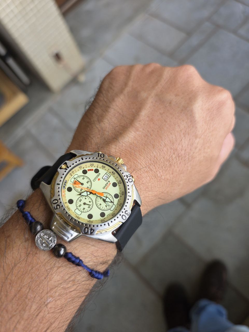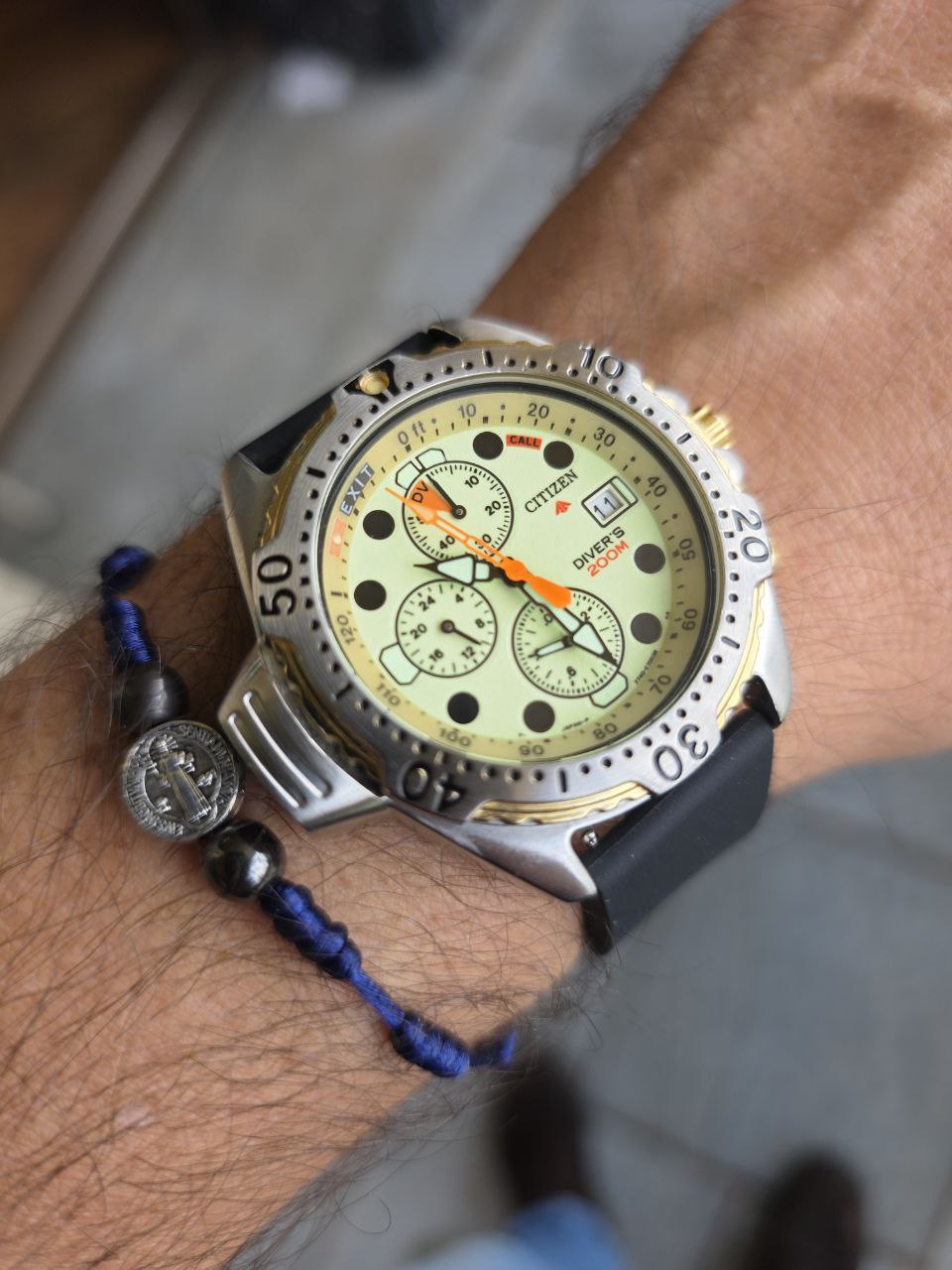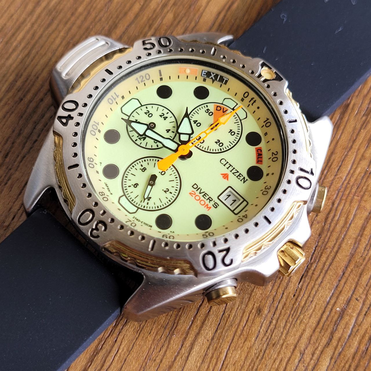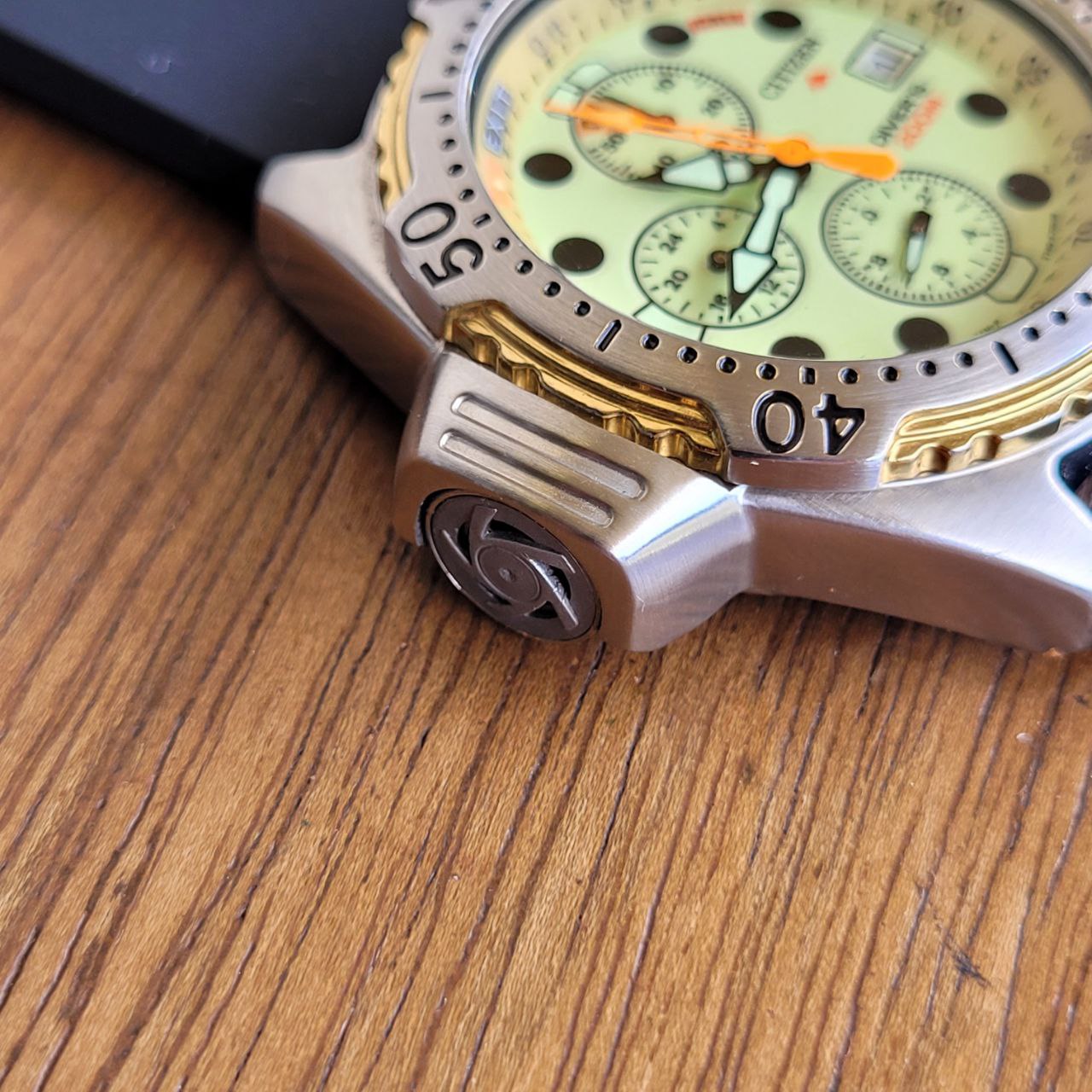 Relógio Citizen Aqualand Diver’s 200m, modelo clássico dos anos 90, com mostrador Full Lume em tom amarelo-esverdeado que brilha completamente no escuro.