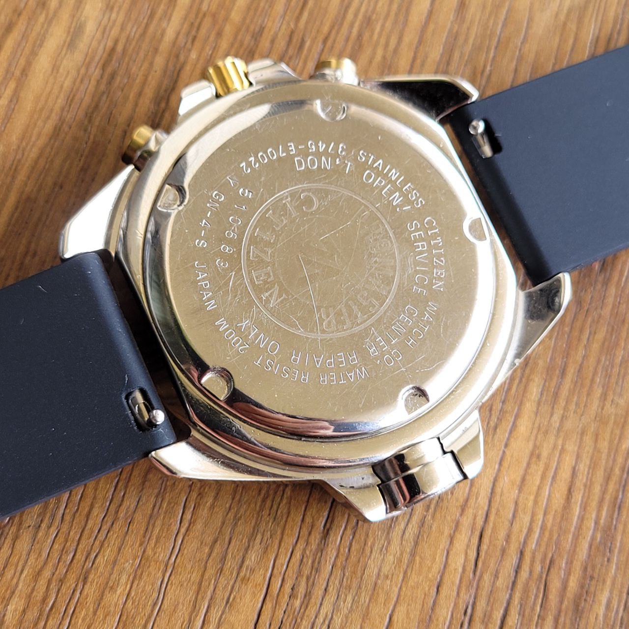 A caixa possui detalhes em aço e acabamento dourado, bezel giratório unidirecional e vidro mineral. Fundo rosqueado com as marcações da marca Citizen.