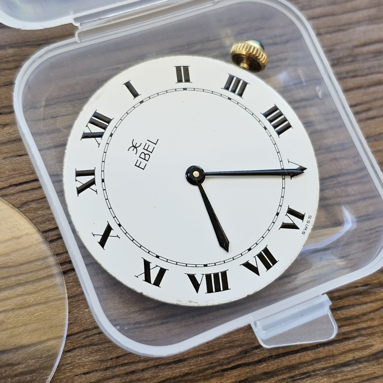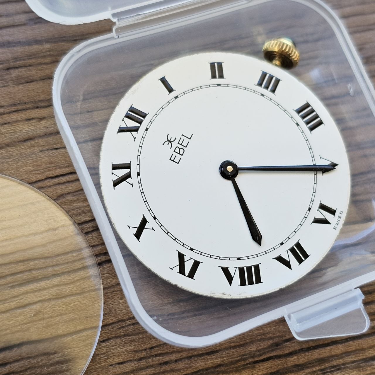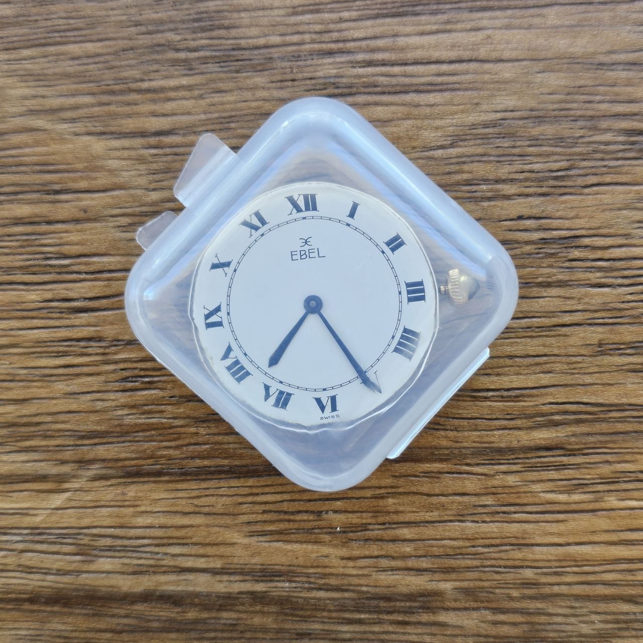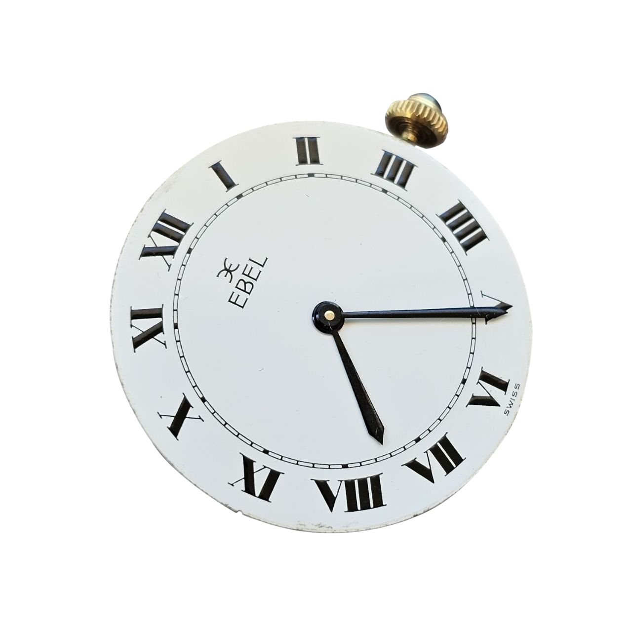 O movimento é mecânico de corda manual e assinado Ebel. Pelas características visíveis, trata-se de um pequeno calibre suíço para relógio feminino, sem segundos aparentes. O calibre exato não pode ser confirmado pelas fotos, mas o conjunto sugere um movimento da família dos pequenos manuais usados pela marca em peças de vestir vintage.