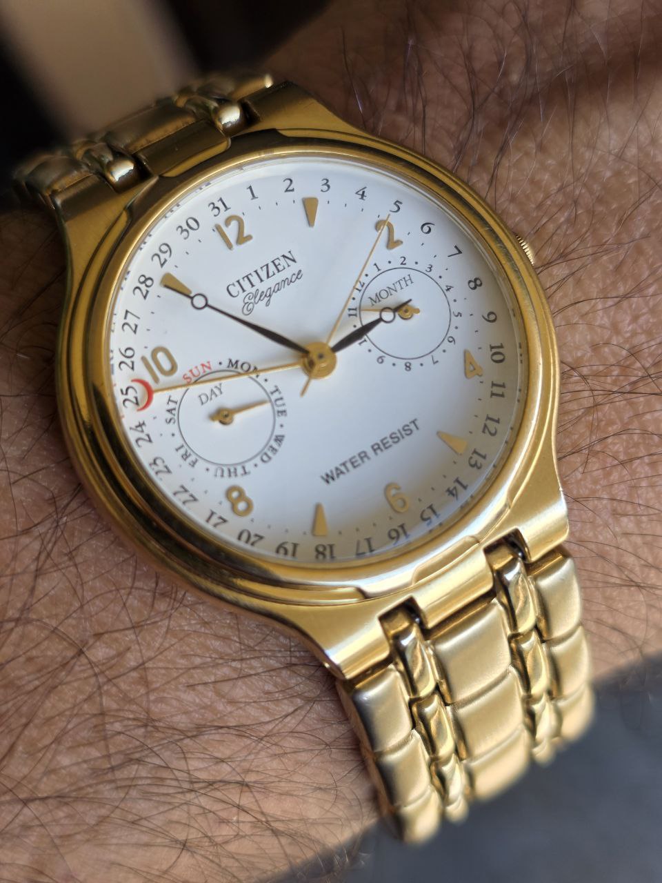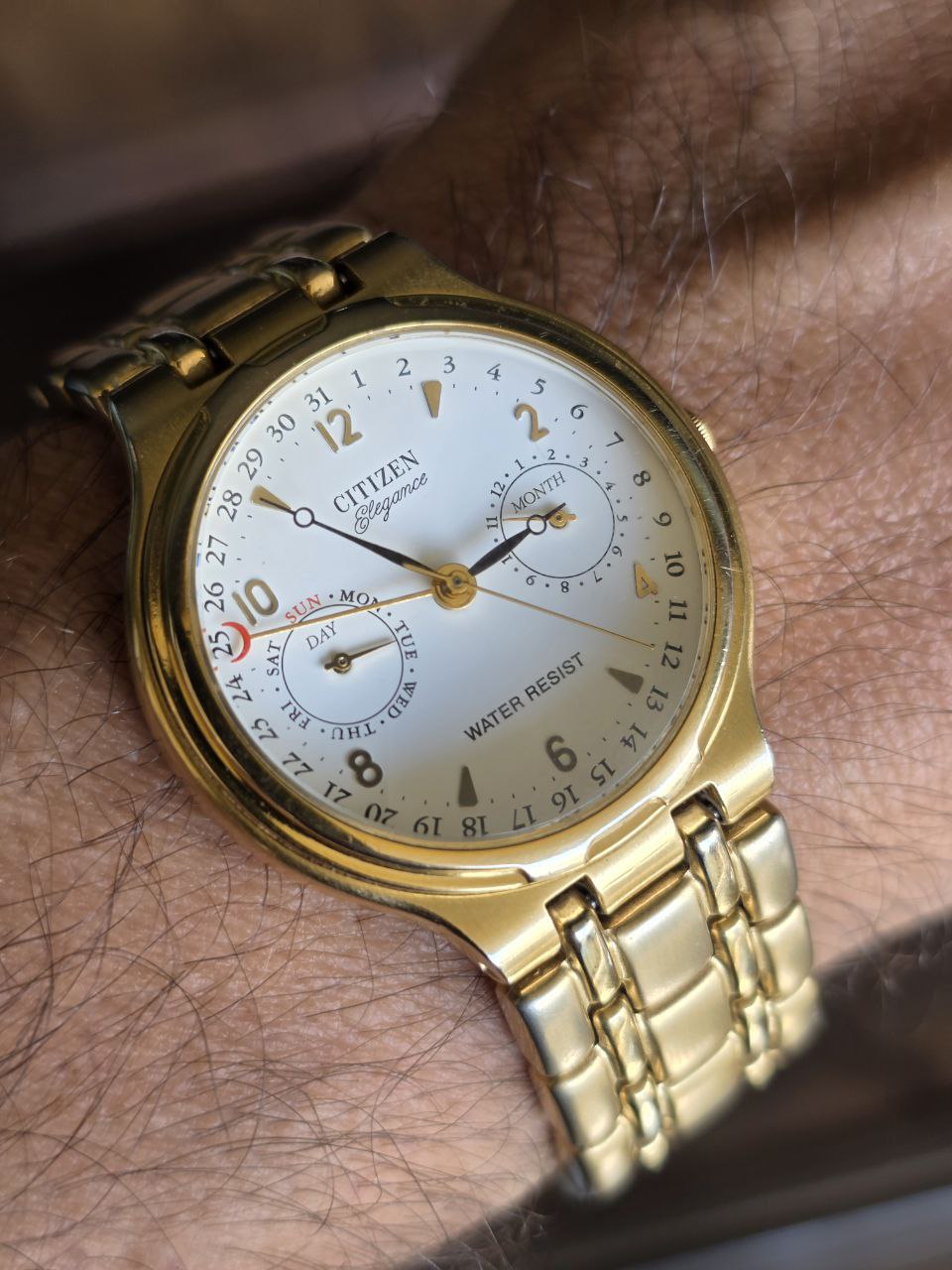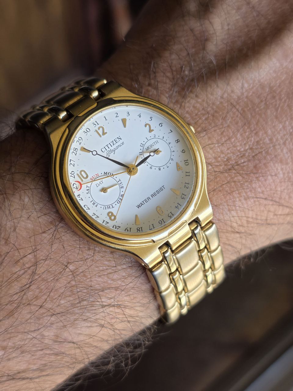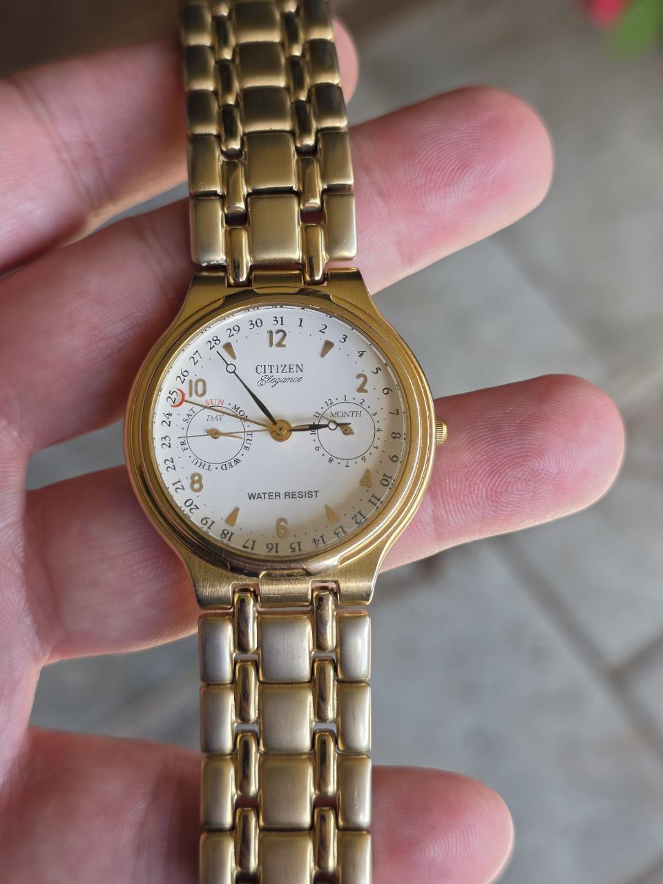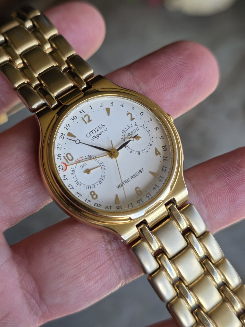 Apresento este elegante e clássico Citizen Elegance Multi-Calendar, um modelo icônico da década de 1990 que reúne design sofisticado, funções analógicas raras e a tradicional precisão japonesa que consagrou a marca.