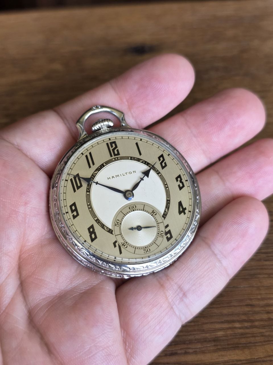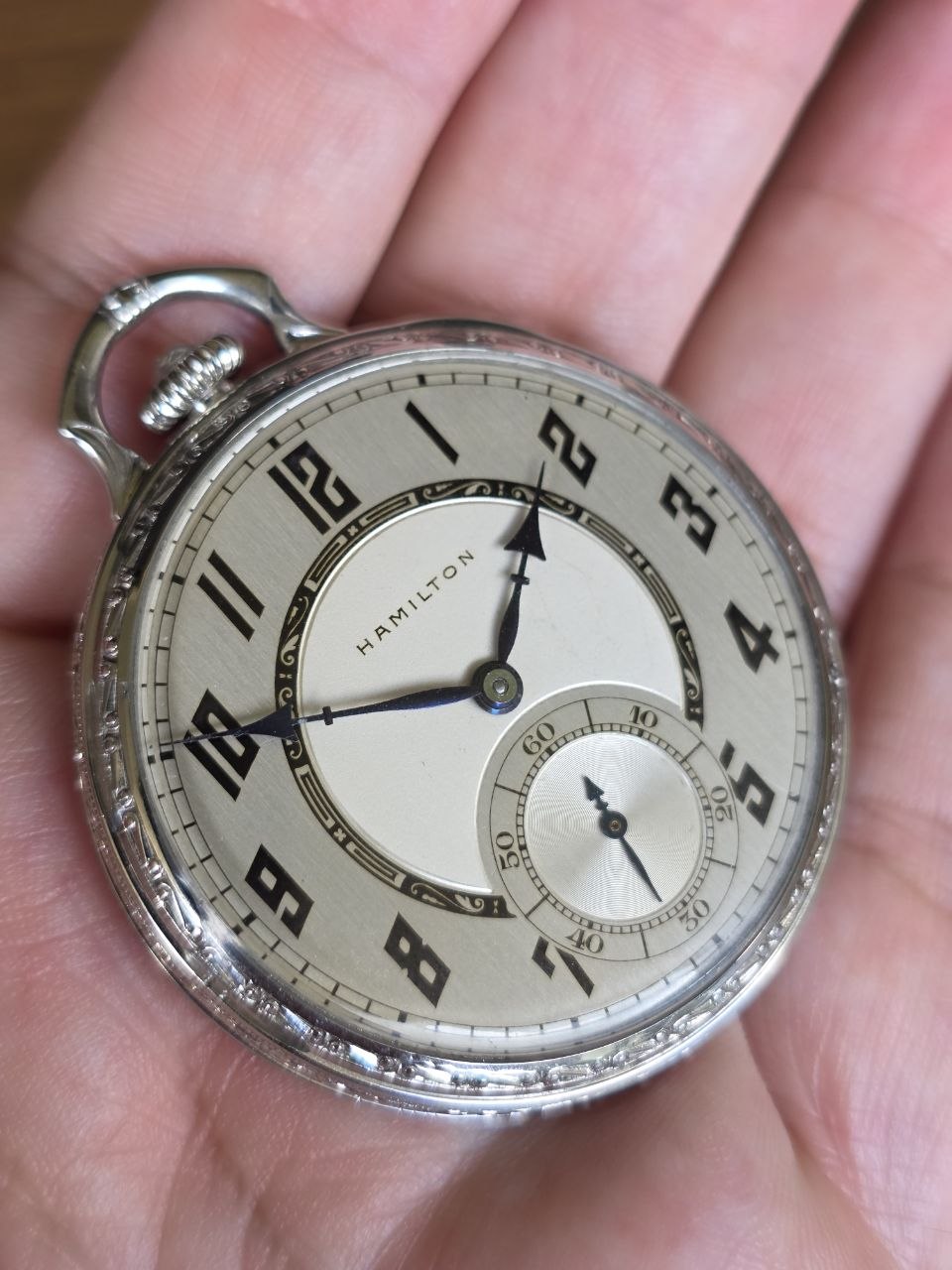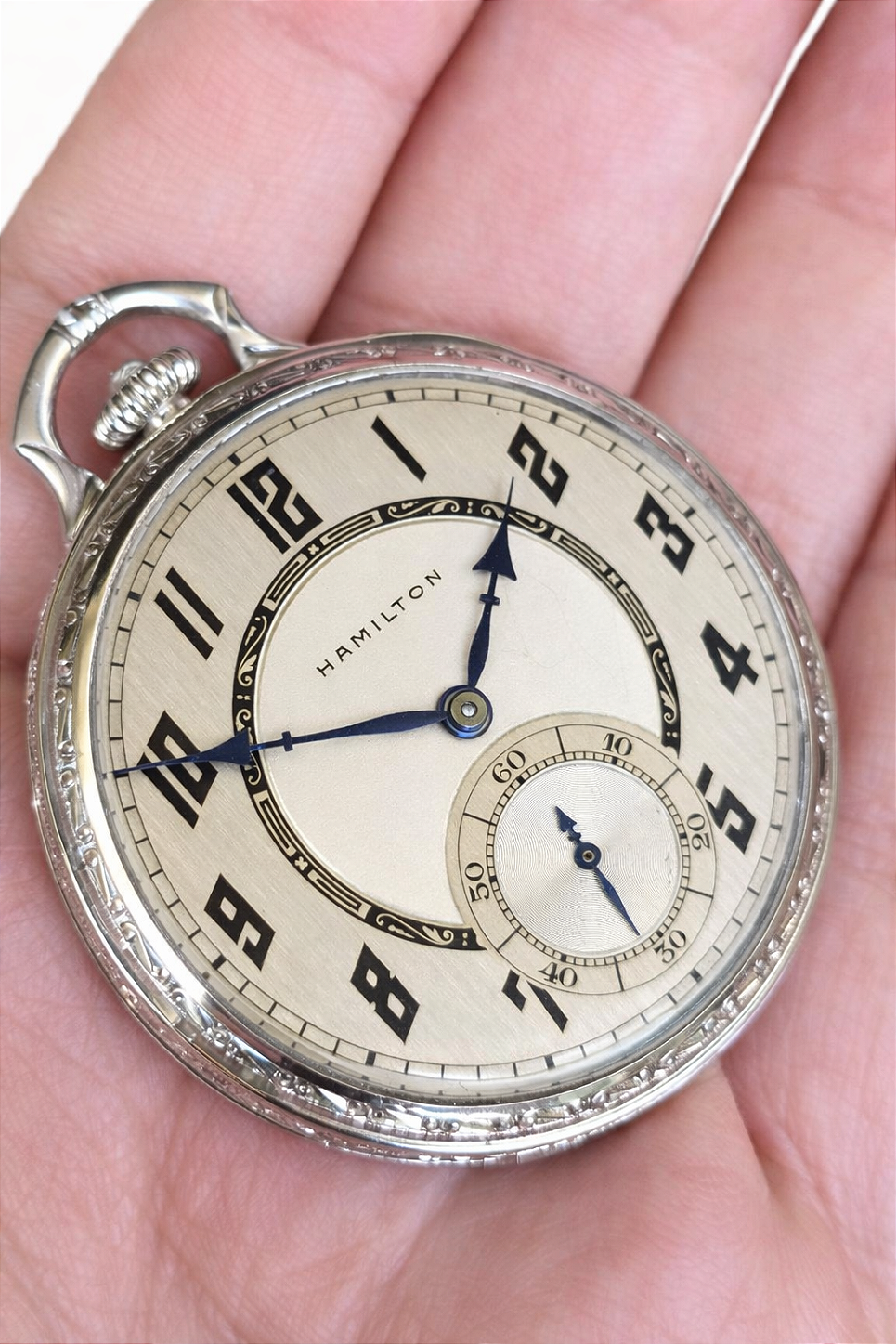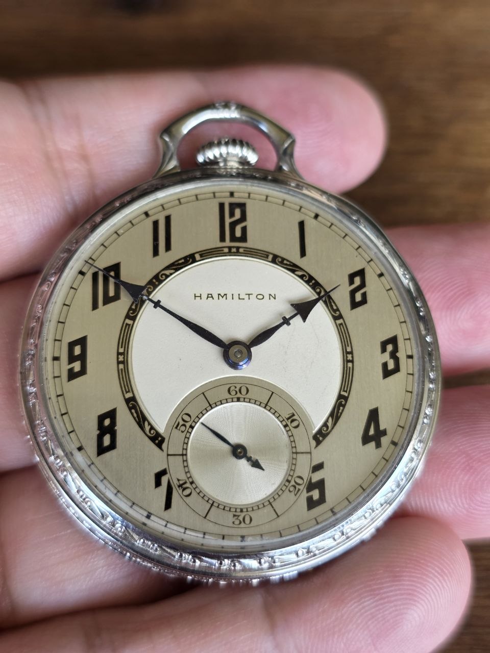 Hamilton de bolso original, calibre 912, provável circa 1934, era Art Deco, recém-revisado, extremamente bonito e raro de aparecer nesse nível de conservação. Peça para coleção, presente de alto nível ou composição de acervo de relógios americanos clássicos.