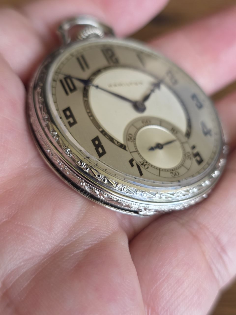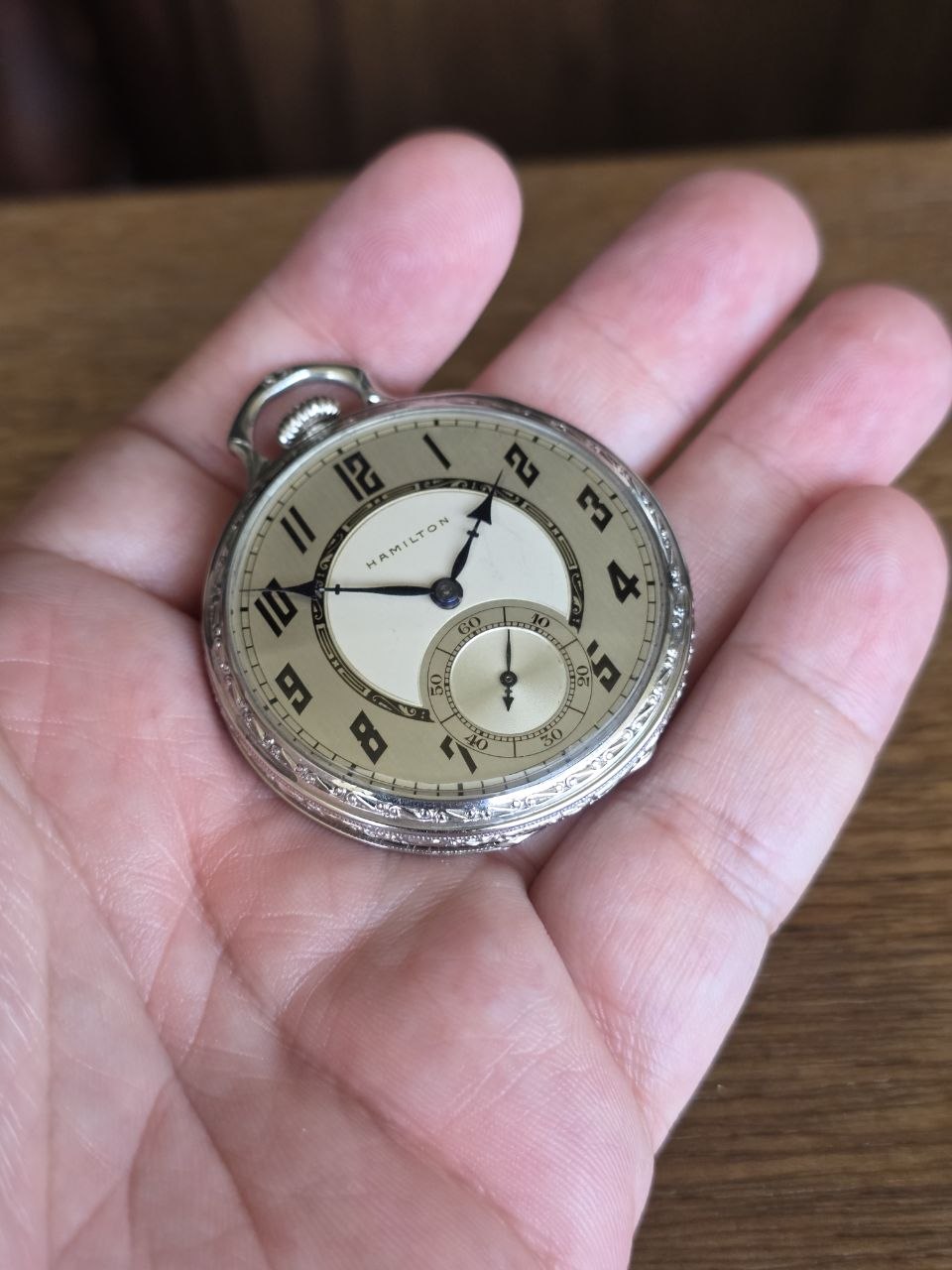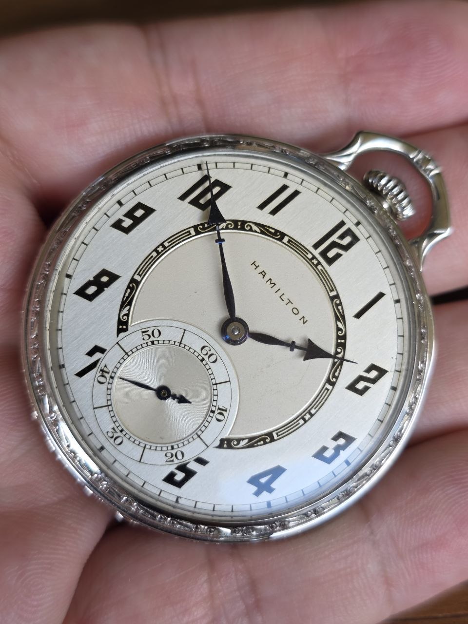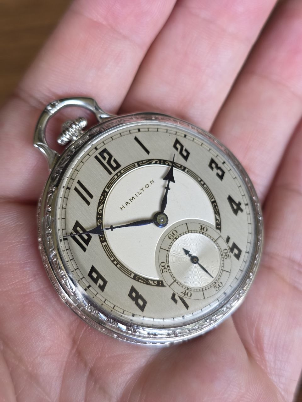 Hamilton de bolso original, calibre 912, provável circa 1934, era Art Deco, recém-revisado, extremamente bonito e raro de aparecer nesse nível de conservação. Peça para coleção, presente de alto nível ou composição de acervo de relógios americanos clássicos.