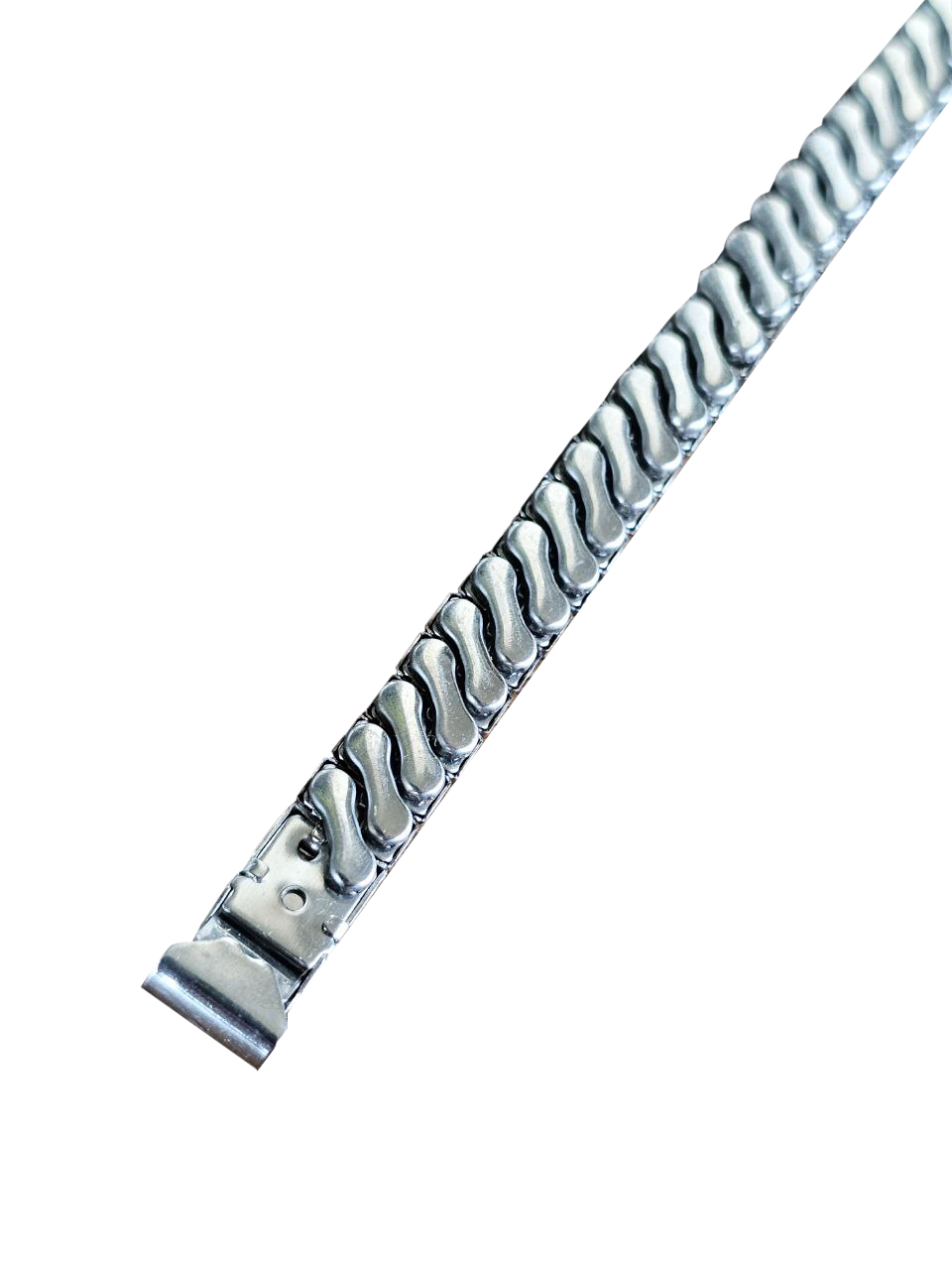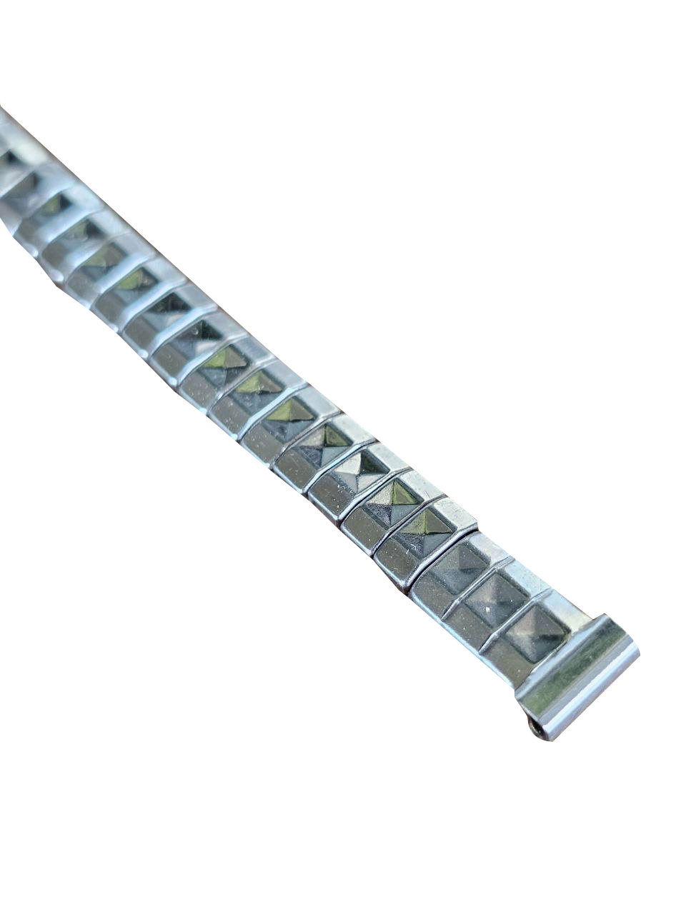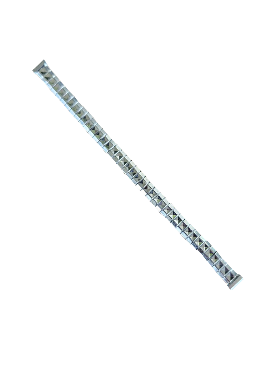 Modelo em aço inoxidável com design geométrico de elos piramidais, visual marcante e extremamente característico do estilo retrô da época. Ideal para restauração de relógios vintage ou para quem busca personalidade e autenticidade no pulso.
