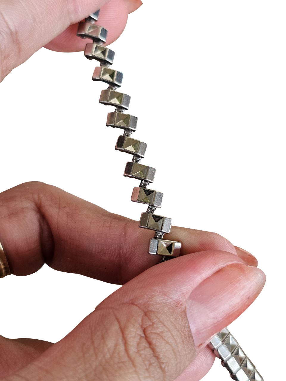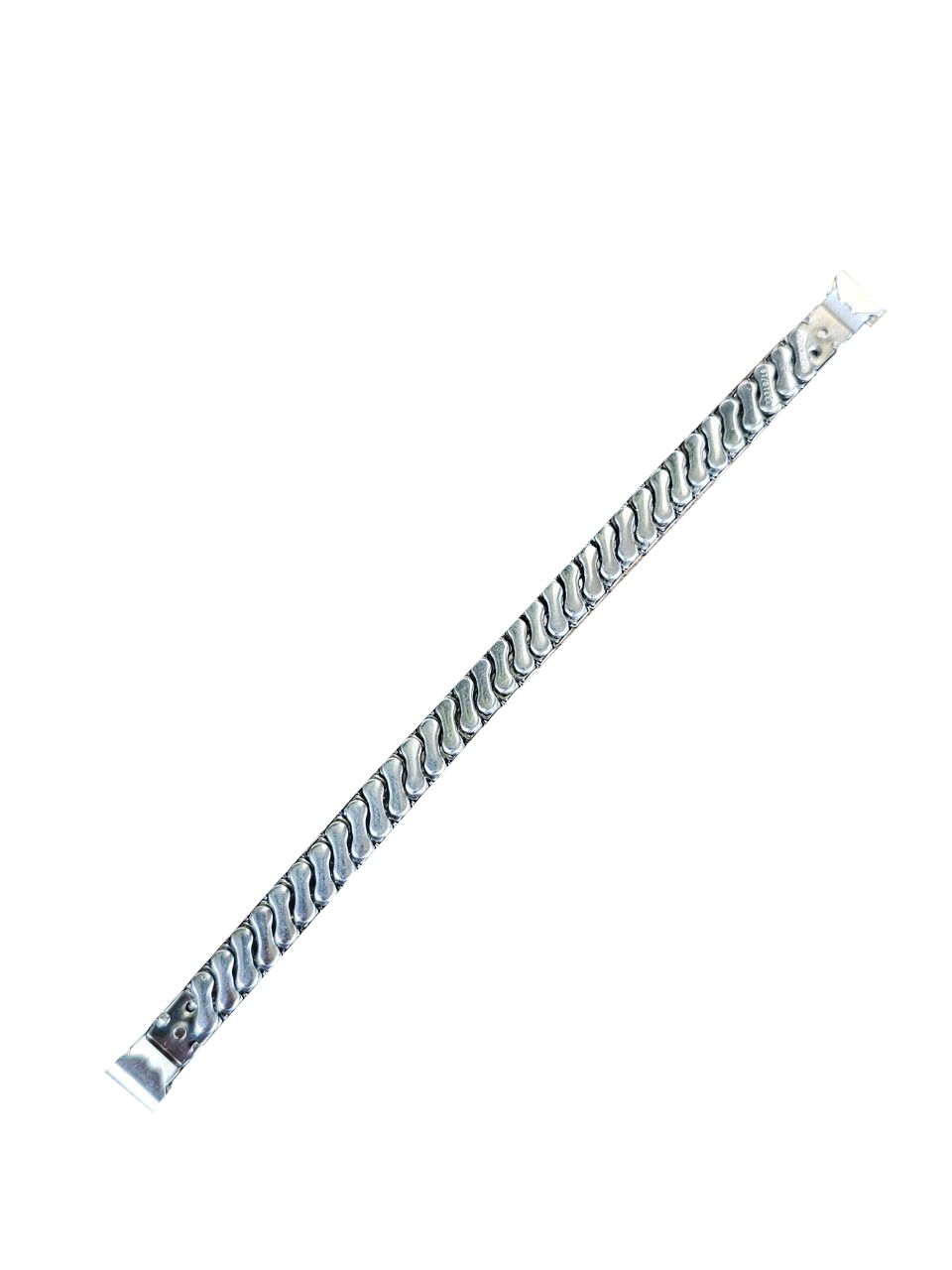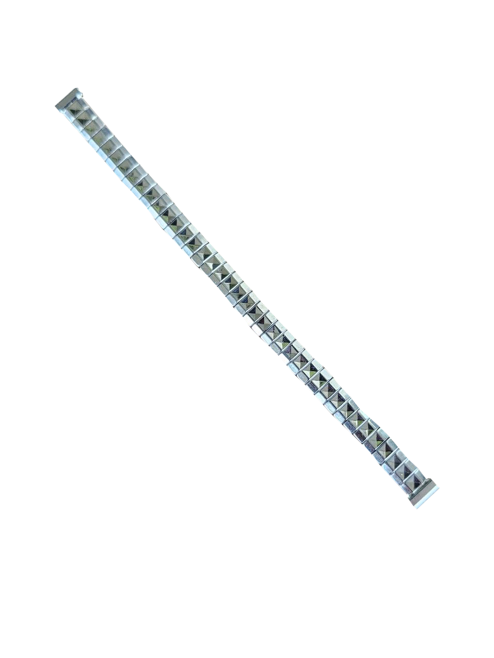 Modelo em aço inoxidável com design geométrico de elos piramidais, visual marcante e extremamente característico do estilo retrô da época. Ideal para restauração de relógios vintage ou para quem busca personalidade e autenticidade no pulso.