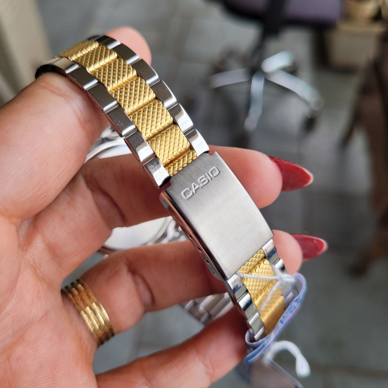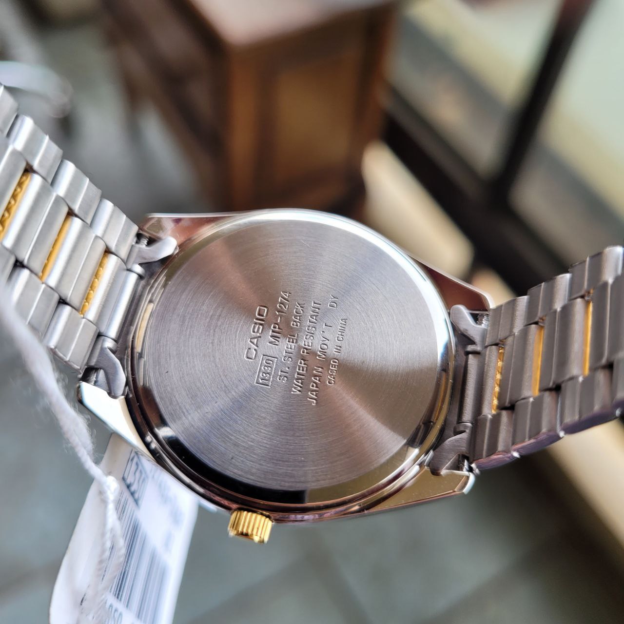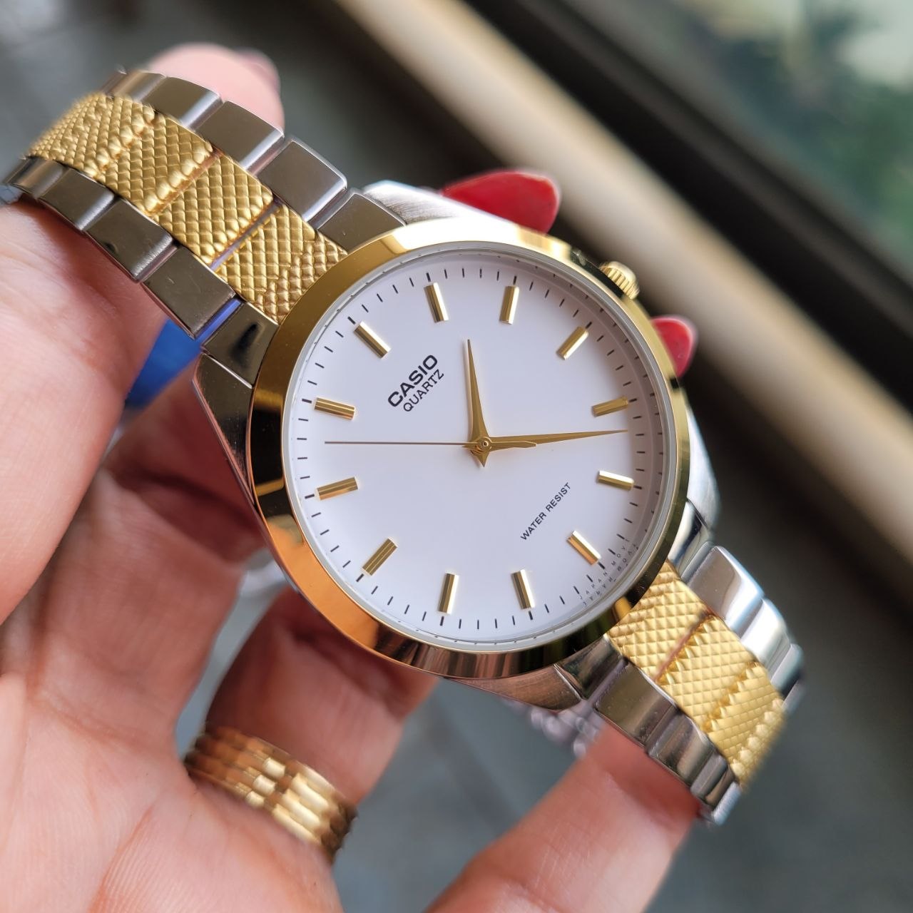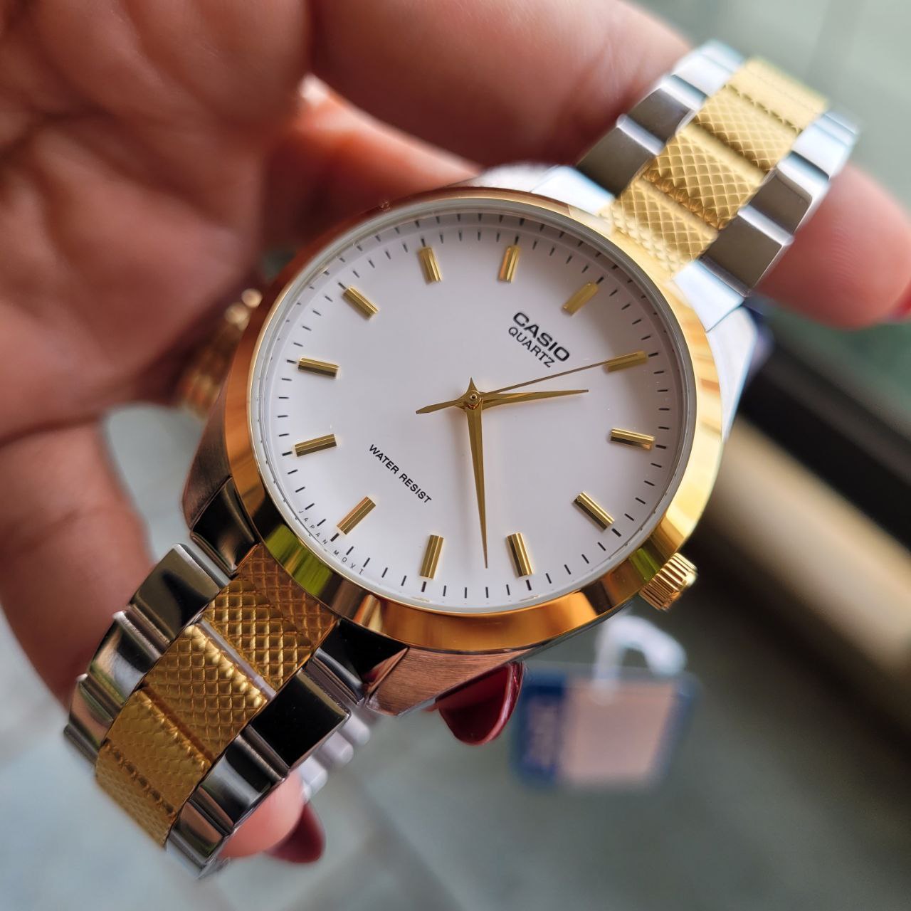Marca: Casio Linha: Dress / Social Modelo: MTP-1274SG-7ADF Módulo: 1330 Tamanho: Largura da caixa: 36mm Espessura da caixa: 8mm Mecanismo: Quartz (movimento a bateria) Movimento japonês (Japan Mov’t) Caixa: Material: Aço Acabamento: Polido bicolor (prata com aro dourado) Tampa traseira: Aço inoxidável rosqueada Mostrador: Cor: Branco Índices: Aplicados em dourado Ponteiros: Dourados Logotipo: Casio Quartz Estilo: Minimalista / Clássico Funções: Horas, minutos e segundos