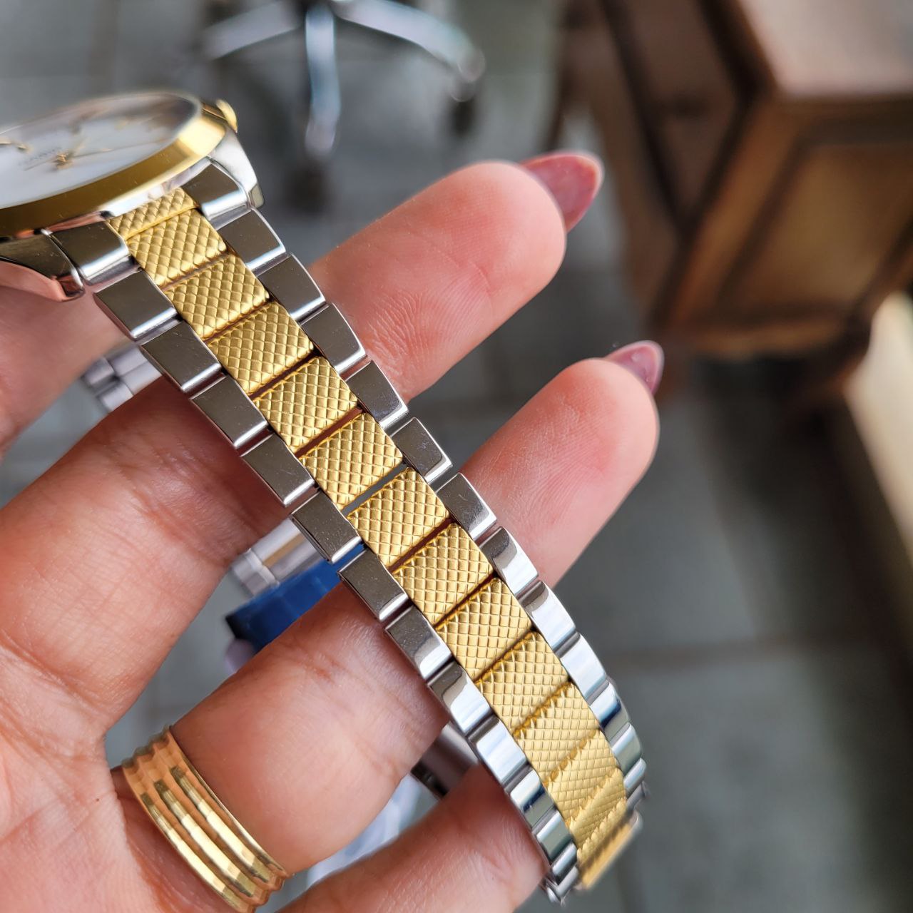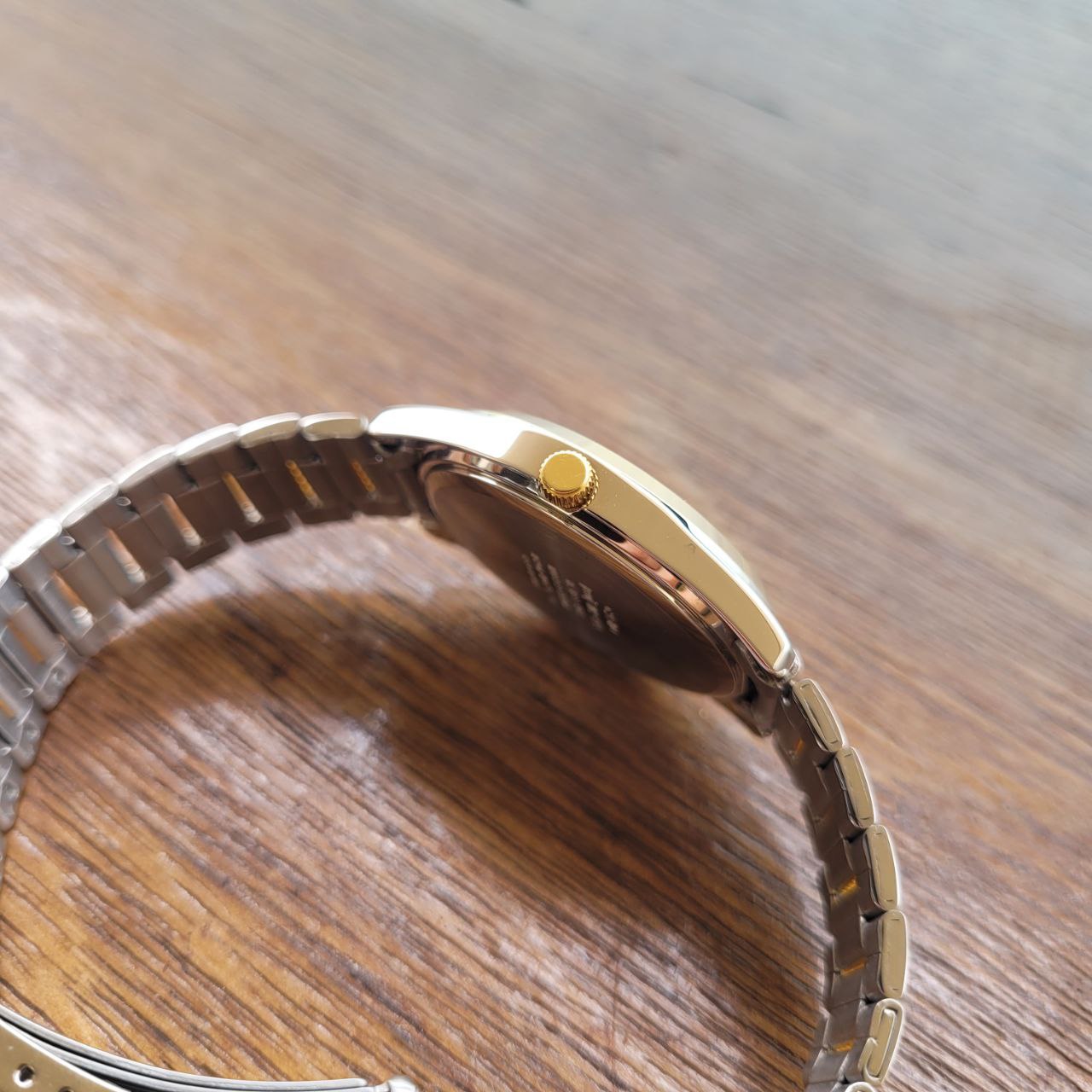 Vidro: Cristal mineral Pulseira: Material: Aço inoxidável Acabamento: Bicolor (prata com detalhes dourados) Fecho: Dobrável