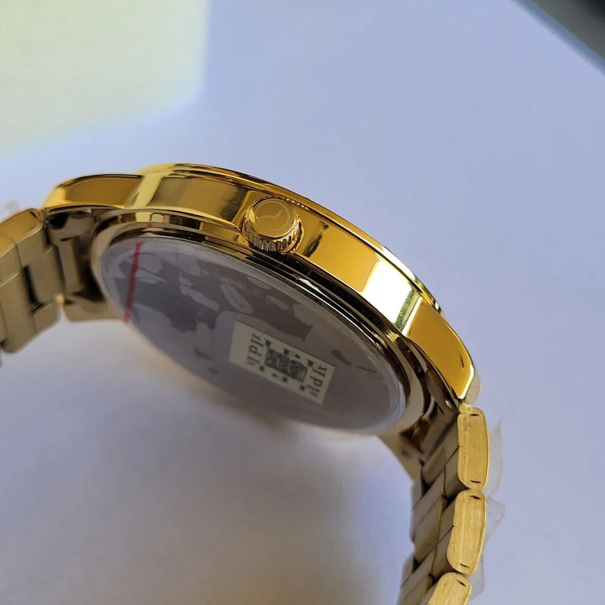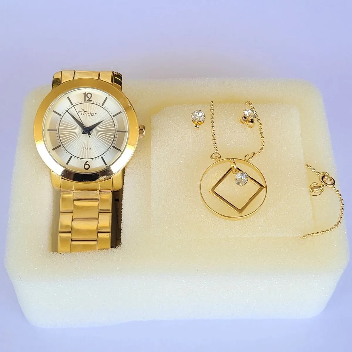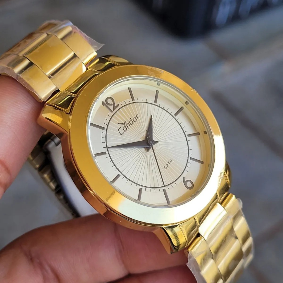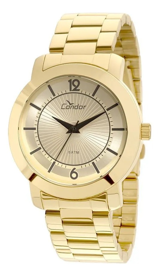 FOTOS REAIS Marca: Condor Gênero: Feminino Tipo de tela: Analógica Mecanismo: Quartzo Relógio: Aço Inoxidável Banhado a Ouro Brincos e colar: Bijuteria Referência do relógio: COAL2035EYU Medidas do relógio: Diâmetro: 40mm e 42.5mm contando a coroa Espessura: 9.5m Cor principal: Dourado Cor do visor: Dourado Pulseira com fecho dobrável Resistência à Água: 5ATM