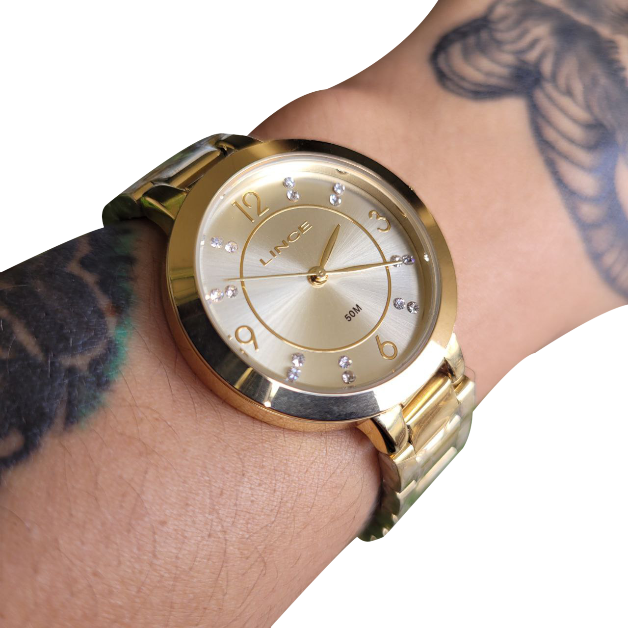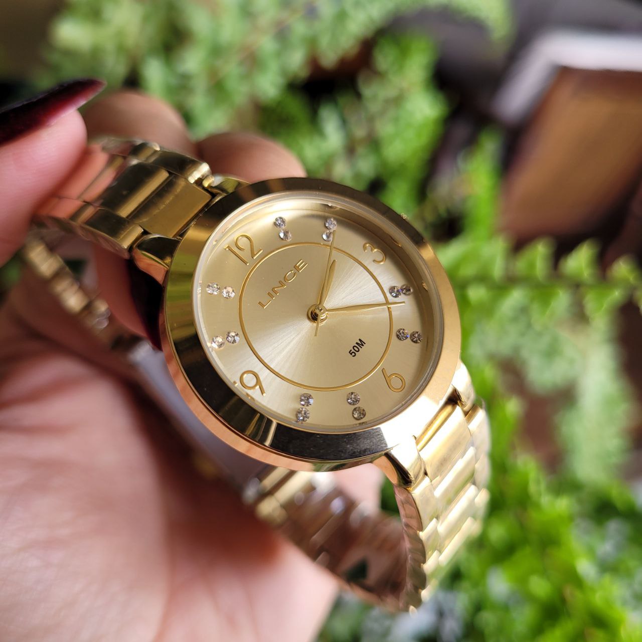 Características: Com caixa dourada e pulseira em aço