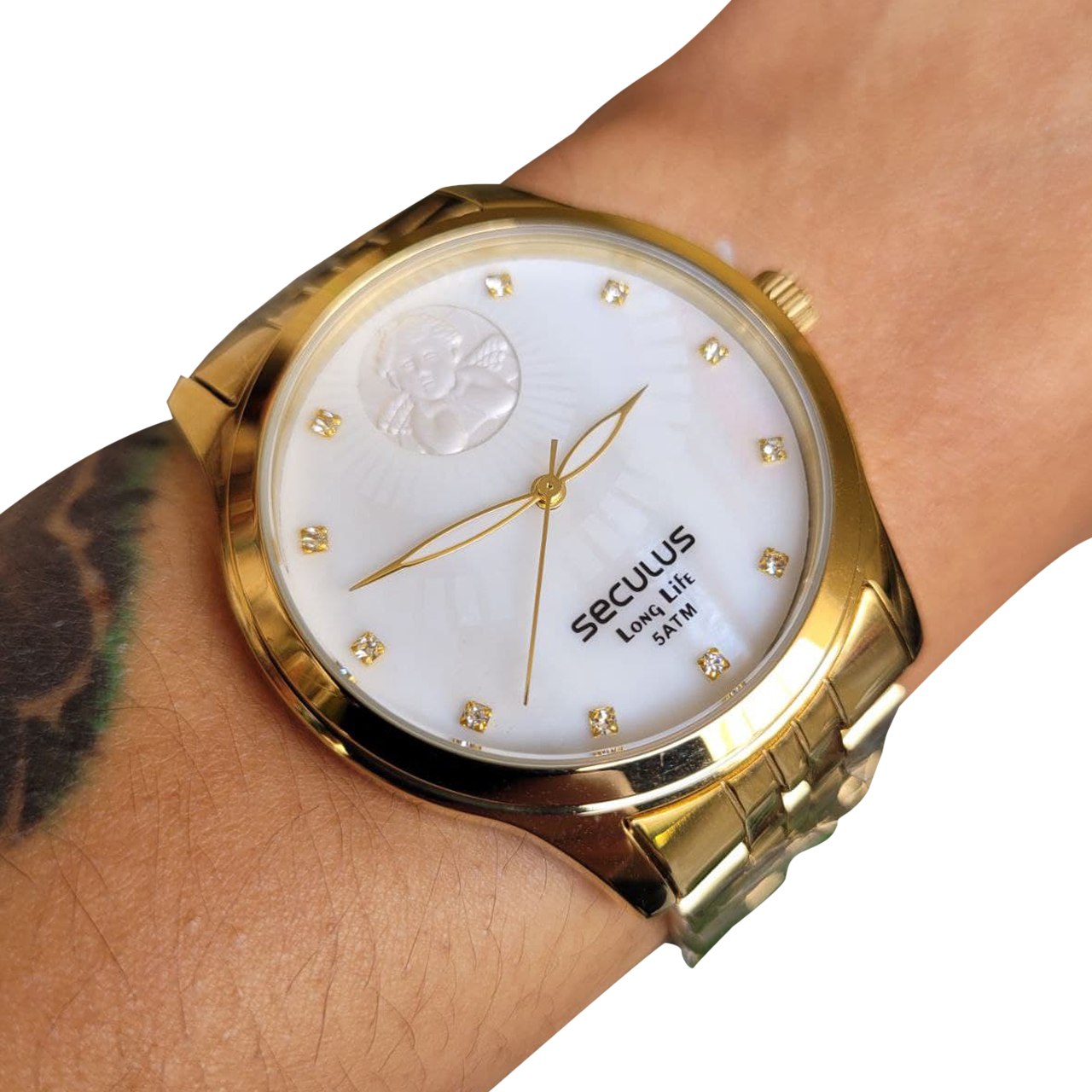 Kit Relógio Seculus Feminino Com Colar Referência/SKU: 28967LPSKDA1K1; Formato da Caixa: Redondo; Marca: Seculus; Gênero: Feminino; Cor: Dourado; MEDIDAS: Tamanho da Caixa: Médio; Material da Pulseira: Aço; Mecanismo: Analógico; Comprimento do Relógio: 23 cm; Pulseira Ajustável: Sim; Material da Caixa: Aço; Espessura da Caixa: 0,9 cm; Dimensões da Caixa: 3,8 cm de diâmetro; Material do Vidro: Cristal Mineral. Nível de Resistência à Água 50m; Calendário: Não tem Calendário; Iluminação Noturna: Marcadores com Illuminator; Fornecedor Seculus da Amazônia Indústria e Comércio SA. CNPJ: 34.516.088/0001-10 O que Acompanha o Produto: Estojo Original; Acessórios Originais (correspondentes a cada modelo); Manual em Português; Certificado de Garantia do Fabricante; Nota Fiscal Eletrônica. Linha/Coleção Seculus Long Life.