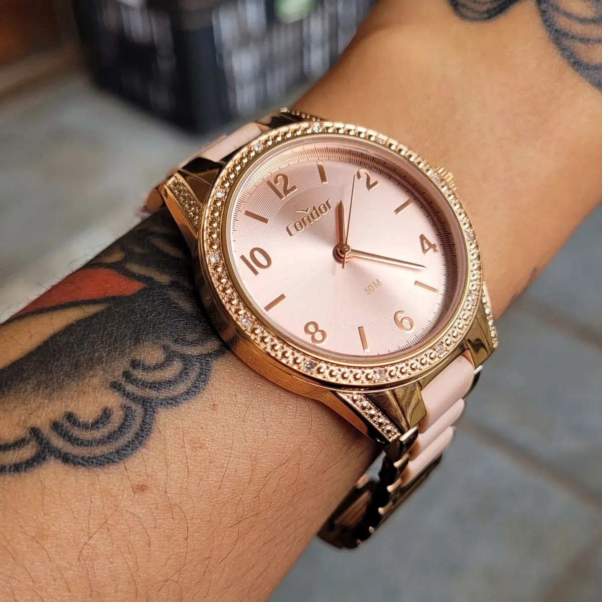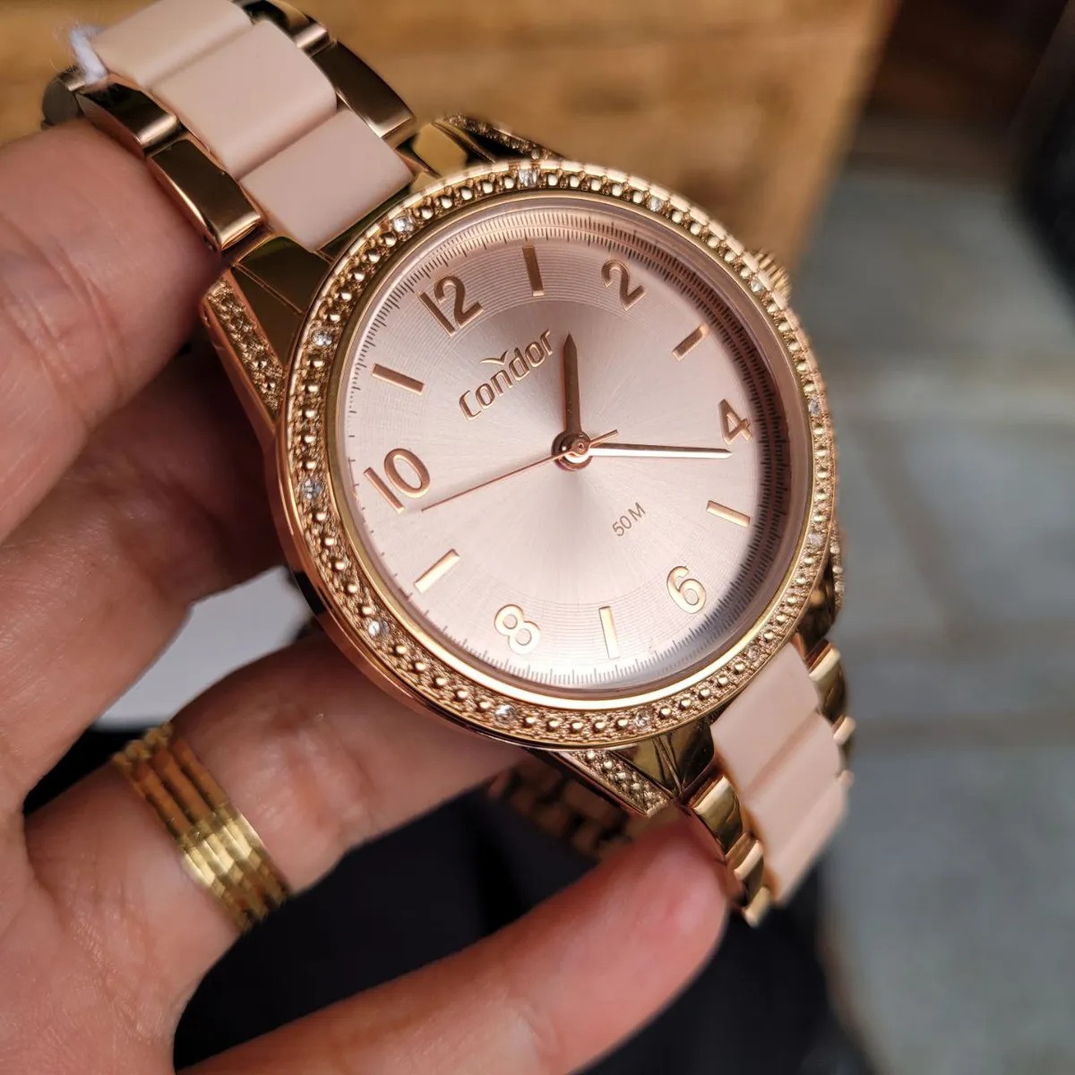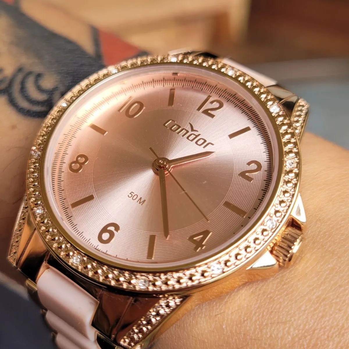Marca: CONDOR; Série: STRASS; Modelo: CO203MV0/4J; Gênero: FEMNINO; Movimento: QUARTZO; Diâmetro da caixa: 39.6mm; Altura da caixa: 9.5mm; Material da Caixa: AÇO INOXIDÁVEL; Cor da Caixa: OURO ROSA; Cor do Mostrador: OURO ROSA; Calendário: NÃO; Tipo de Vidro: MINERAL; Tipo de Coroa: PUXAR/EMPURRAR; Resistência a água: 50m; Material da Pulseira: AÇO INOXIDÁVEL; Largura da Pulseira: 18mm; Tipo de Fecho: DOBRÁVEL COM BOTÕES DE SEGURANÇA.