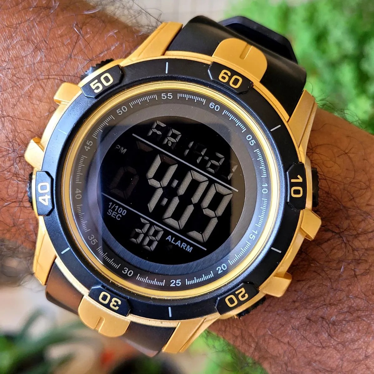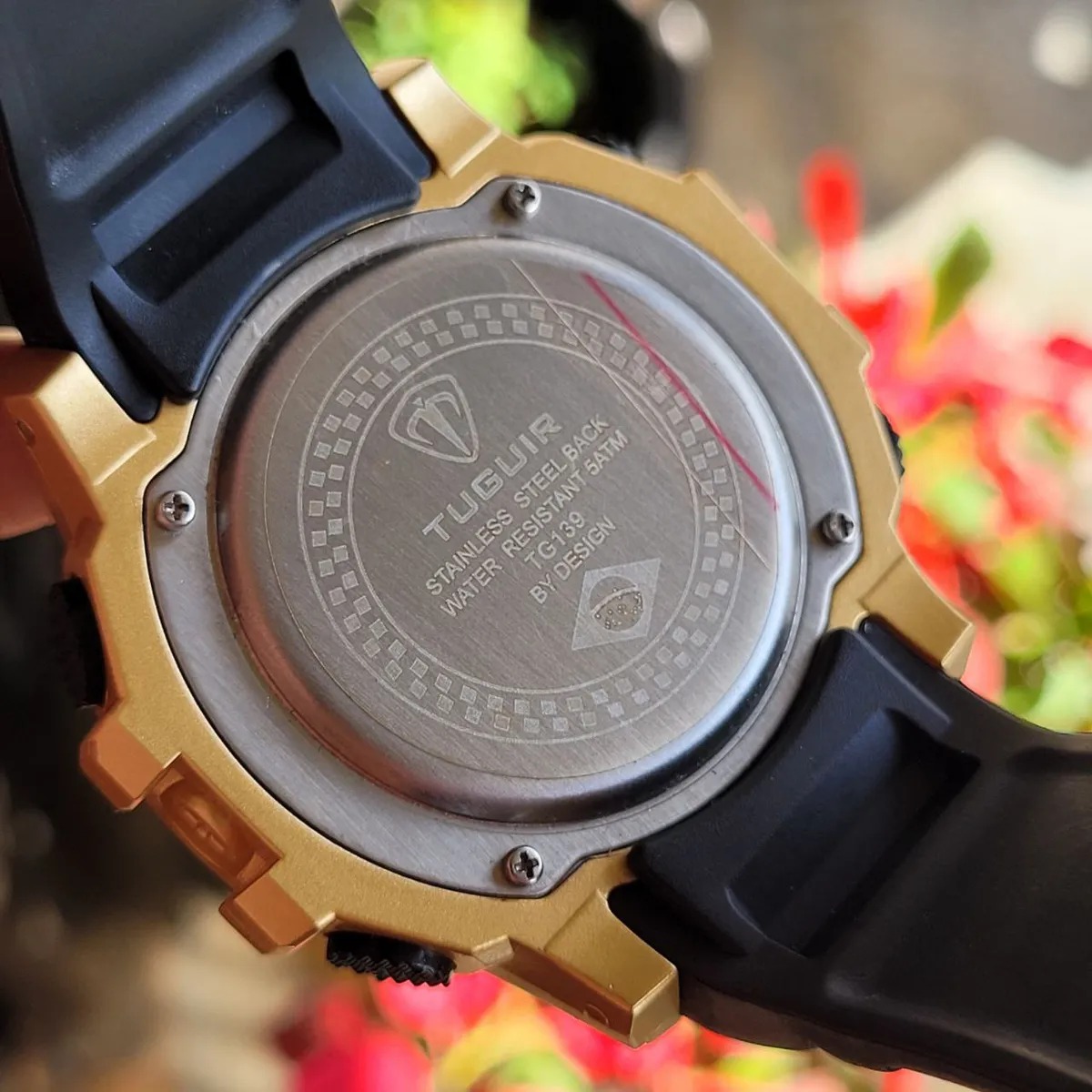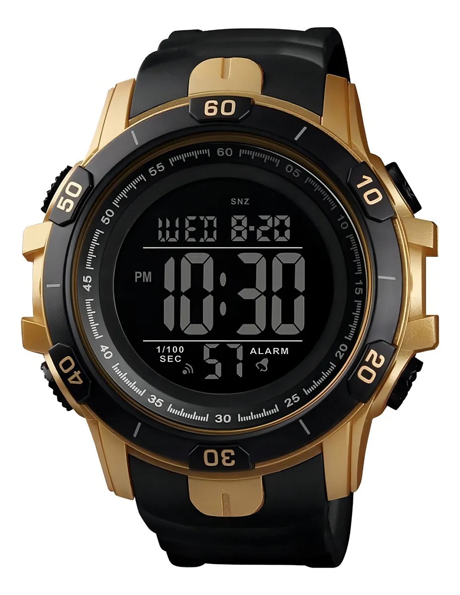 Chegar tarde aos seus compromissos não é mais uma opção, com este relógio de pulso cumpra com todos os horários e não perca nenhum evento importante. Adicione estilo ao seu outfit, é o complemento ideal. Relógio Masculino Tuguir Digital TG139 Dourado e Preto Marca: Tuguir; Categoria: Digital; Analógico: Não; Digital: Sim (1 Horário); Calendário: Sim; Despertador: Sim; Mostra o Dia da Semana: Sim; Mostra o Dia do Mês: Sim; Cronômetro: Sim; Contador Regressivo: Sim; Luz: Sim; Cor da Iluminação: Verde; Resistente à Água: 5 atm (Pode ser usado para nadar no raso, por pouco tempo submerso); - Respingos: Sim; - Chuva: Sim; - Lavar Carro: Sim; - Lavar Louça: Sim; - Natação: Sim; - Mergulho: Não; Característica do Vidro: Cristal Mineral; Tipo de Fecho: Fivela; Cor da Caixa: Dourado; Material da Caixa: Plástico; Formato da Caixa: Redondo; Diâmetro da Caixa: 55,60 (mm); Espessura da Caixa: 17,40 (mm); Cor da Pulseira: Preto; Material da Pulseira: Plástico; Largura da Pulseira: 23,80 (mm); Comprimento Máximo da Pulseira: 220,00 (mm); Alimentação: Bateria Interna; Peso Líquido: 0,060 Kg; Modelo: TG139; Cor Predominante: Dourado; Cor Diferencial: Preto. Garantia do vendedor: 3 meses