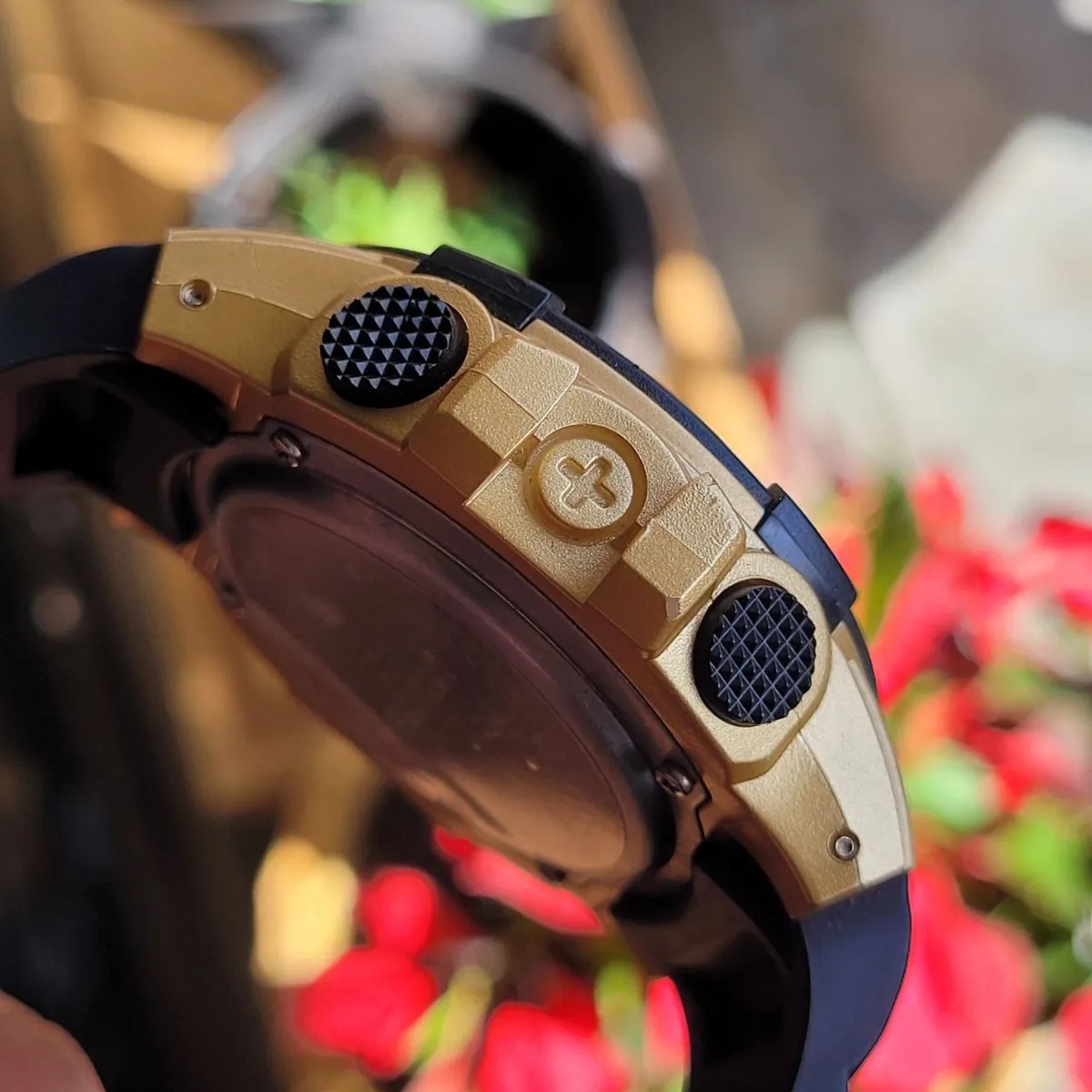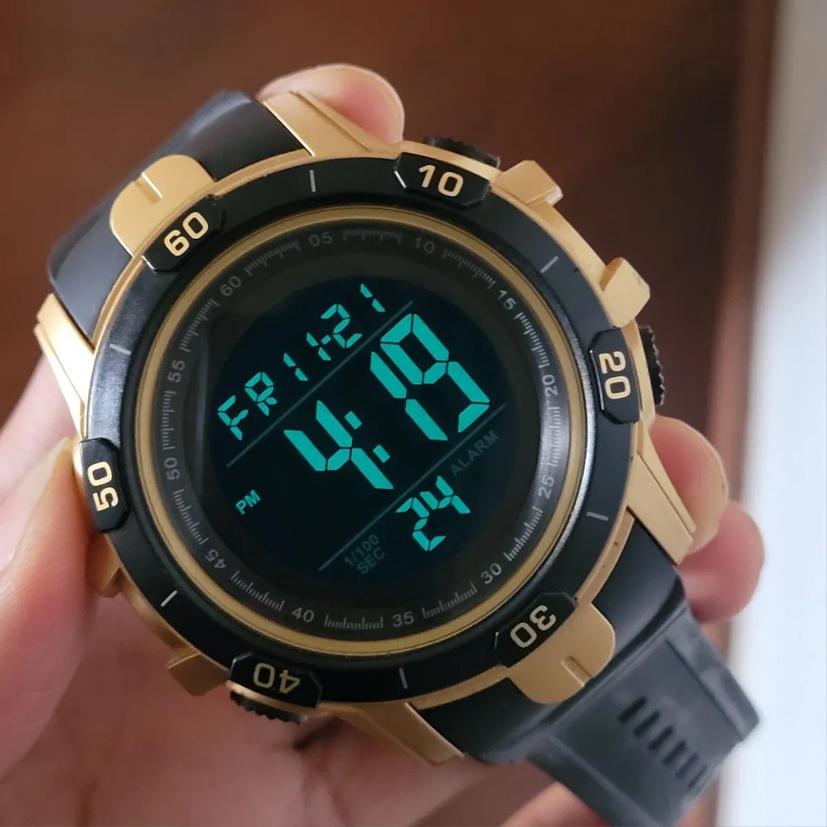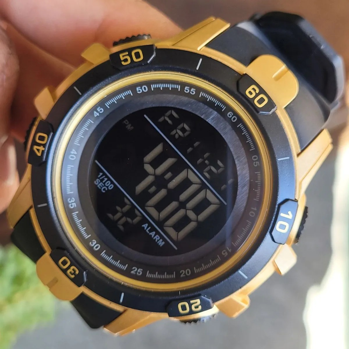 Chegar tarde aos seus compromissos não é mais uma opção, com este relógio de pulso cumpra com todos os horários e não perca nenhum evento importante. Adicione estilo ao seu outfit, é o complemento ideal. Relógio Masculino Tuguir Digital TG139 Dourado e Preto Marca: Tuguir; Categoria: Digital; Analógico: Não; Digital: Sim (1 Horário); Calendário: Sim; Despertador: Sim; Mostra o Dia da Semana: Sim; Mostra o Dia do Mês: Sim; Cronômetro: Sim; Contador Regressivo: Sim; Luz: Sim; Cor da Iluminação: Verde; Resistente à Água: 5 atm (Pode ser usado para nadar no raso, por pouco tempo submerso); - Respingos: Sim; - Chuva: Sim; - Lavar Carro: Sim; - Lavar Louça: Sim; - Natação: Sim; - Mergulho: Não; Característica do Vidro: Cristal Mineral; Tipo de Fecho: Fivela; Cor da Caixa: Dourado; Material da Caixa: Plástico; Formato da Caixa: Redondo; Diâmetro da Caixa: 55,60 (mm); Espessura da Caixa: 17,40 (mm); Cor da Pulseira: Preto; Material da Pulseira: Plástico; Largura da Pulseira: 23,80 (mm); Comprimento Máximo da Pulseira: 220,00 (mm); Alimentação: Bateria Interna; Peso Líquido: 0,060 Kg; Modelo: TG139; Cor Predominante: Dourado; Cor Diferencial: Preto. Garantia do vendedor: 3 meses