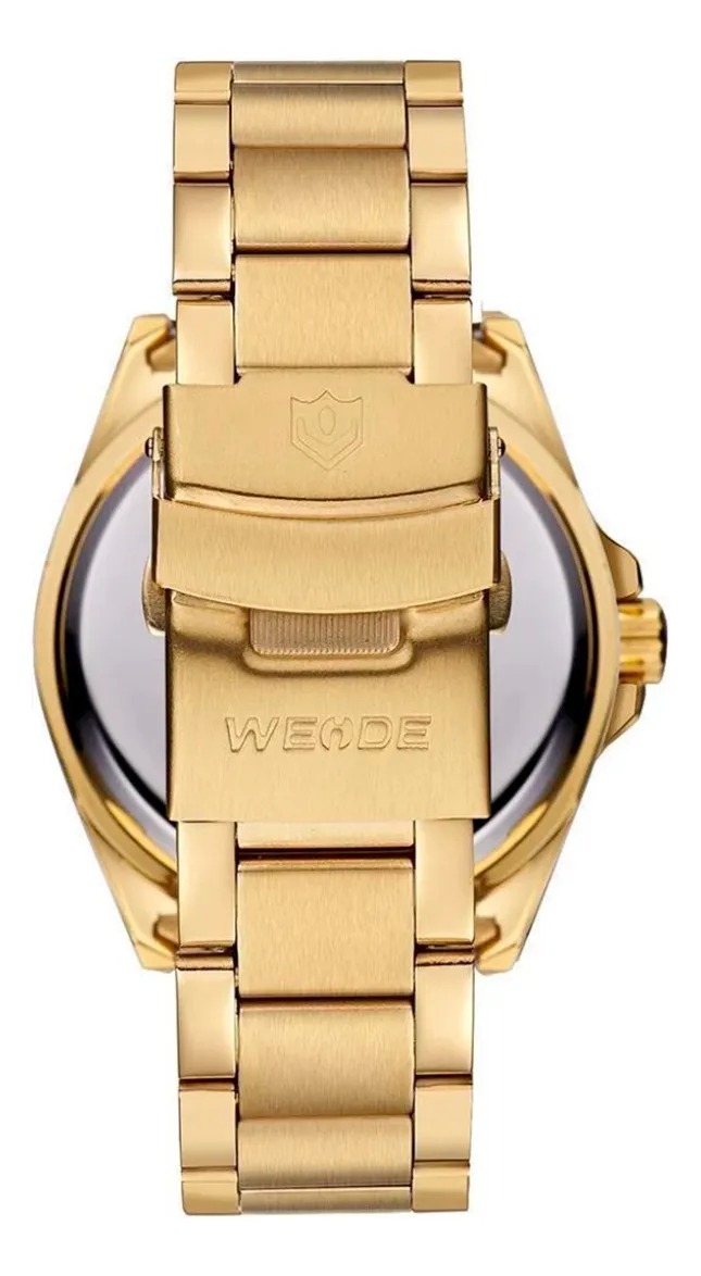 Relógio Masculino Weide Analógico WH801G - Dourado Marca: Weide - Categoria: Analógico Analógico: Sim (1 Horário) - Ponteiros Fluorescentes: Sim - Digital: Não Calendário: Não Despertador: Não Mostra o Dia da Semana: Não Mostra o Dia do Mês: Não Cronômetro: Não Contador Regressivo: Não Luz: Não - Resistente à Água: 3 ATM (Resiste a imersões breves) - Respingos: Sim - Chuva: Sim - Lavar Carro: Sim - Lavar Louça: Sim - Característica do Vidro: Acrílico - Tipo de Fecho: Dobrável com Trava - Cor da Caixa: Dourada - Material da Caixa: Metal - Formato da Caixa: Redondo - Diâmetro da Caixa: 44,00 (mm) - Espessura da Caixa: 11,60 (mm) - Cor da Pulseira: Dourada - Material da Pulseira: Metal - Largura da Pulseira: 20,00 (mm) - Comprimento Máximo da Pulseira: 220,00 (mm) - Alimentação: Bateria Interna Peso Líquido: 0,110 Kg - Modelo: WH801G - Cor Predominante: Dourado Garantia do vendedor: 3 meses