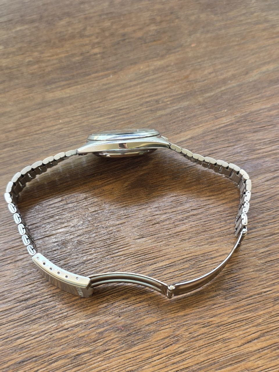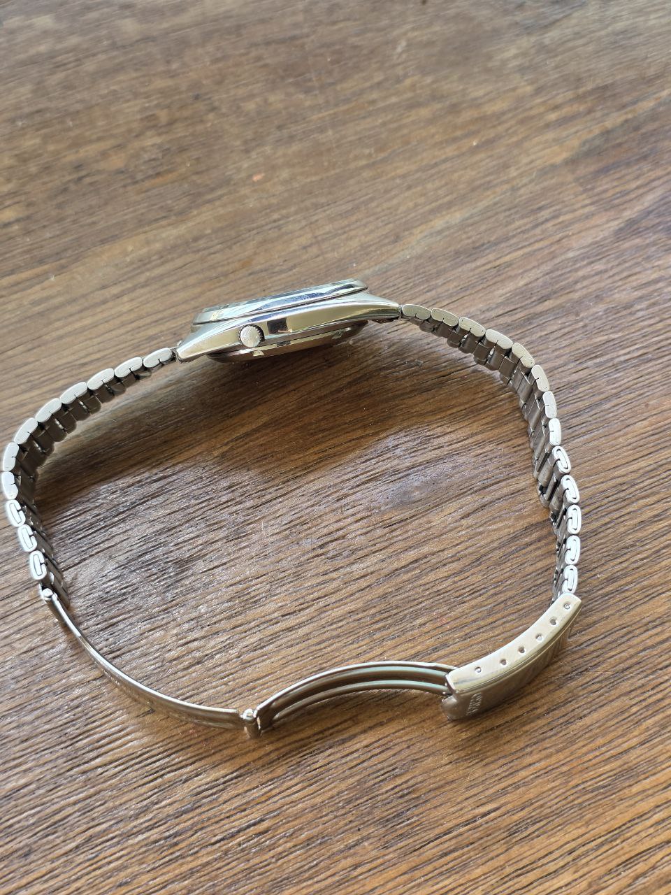 O relógio apresenta caixa com linhas suaves e proporções típicas dos anos 80, mostrador azul com acabamento sunburst, índices aplicados e função day-date. A pulseira metálica complementa o visual clássico esportivo da época.