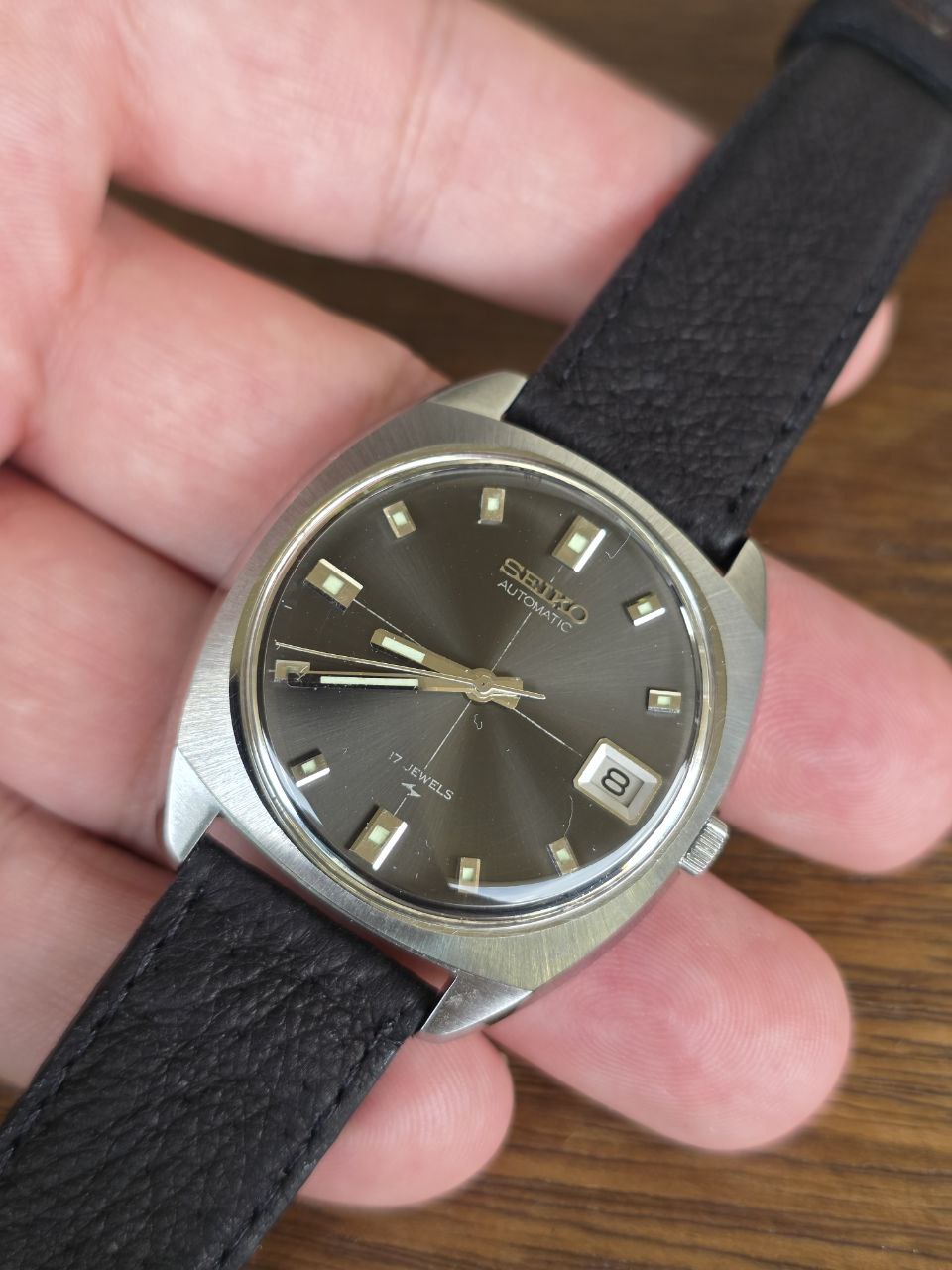O relógio apresenta caixa em formato cushion, mostrador cinza com acabamento escovado, índices aplicados com material luminoso e ponteiros largos, características típicas dos anos 70. A janela de data com moldura metálica reforça o estilo elegante e funcional.