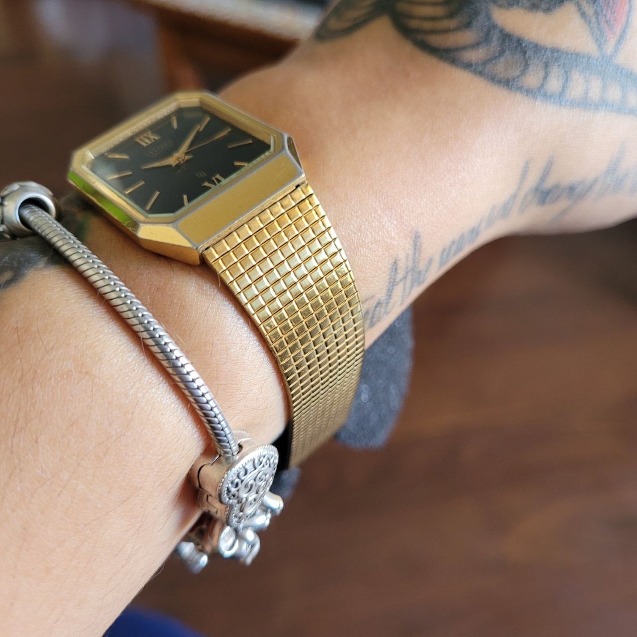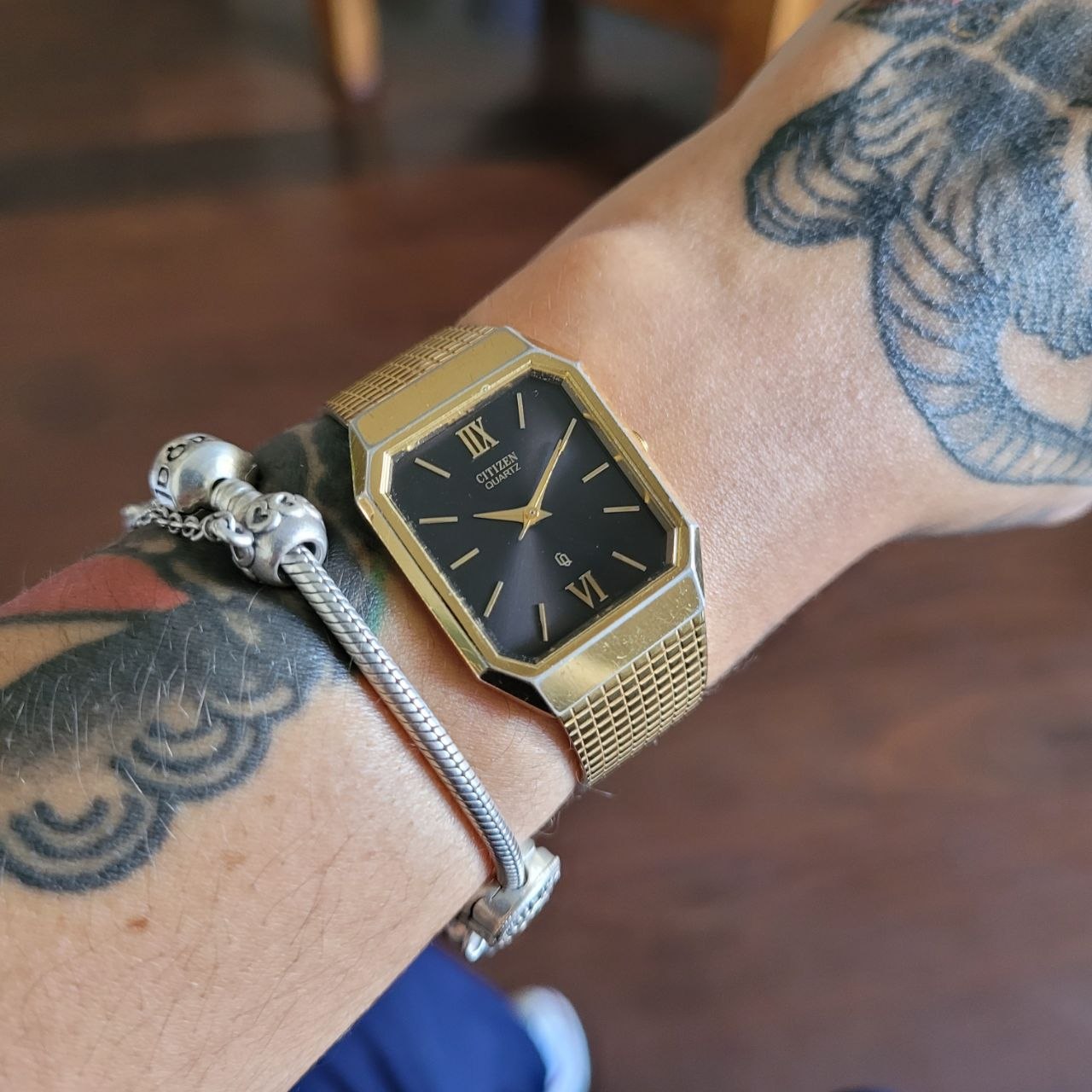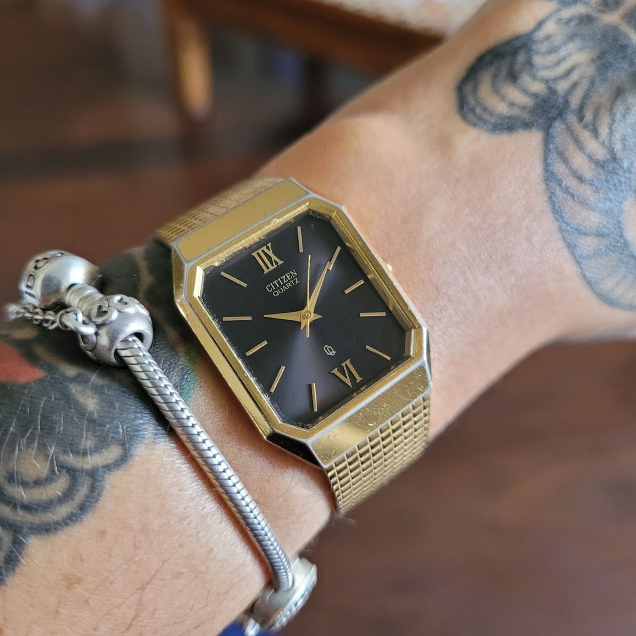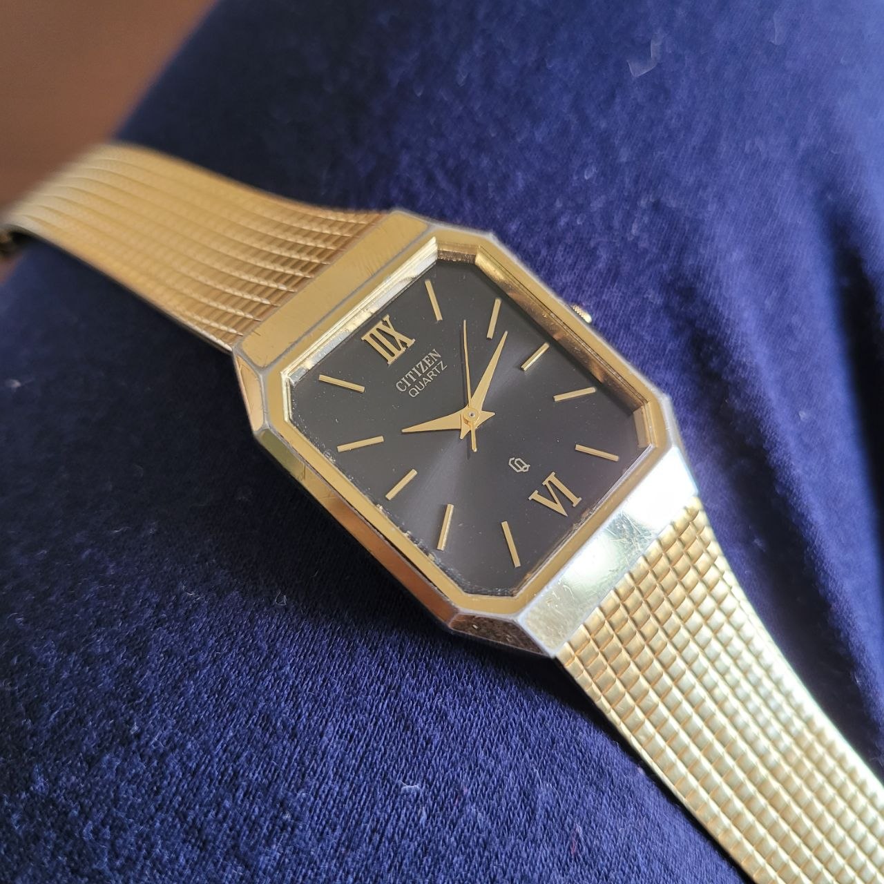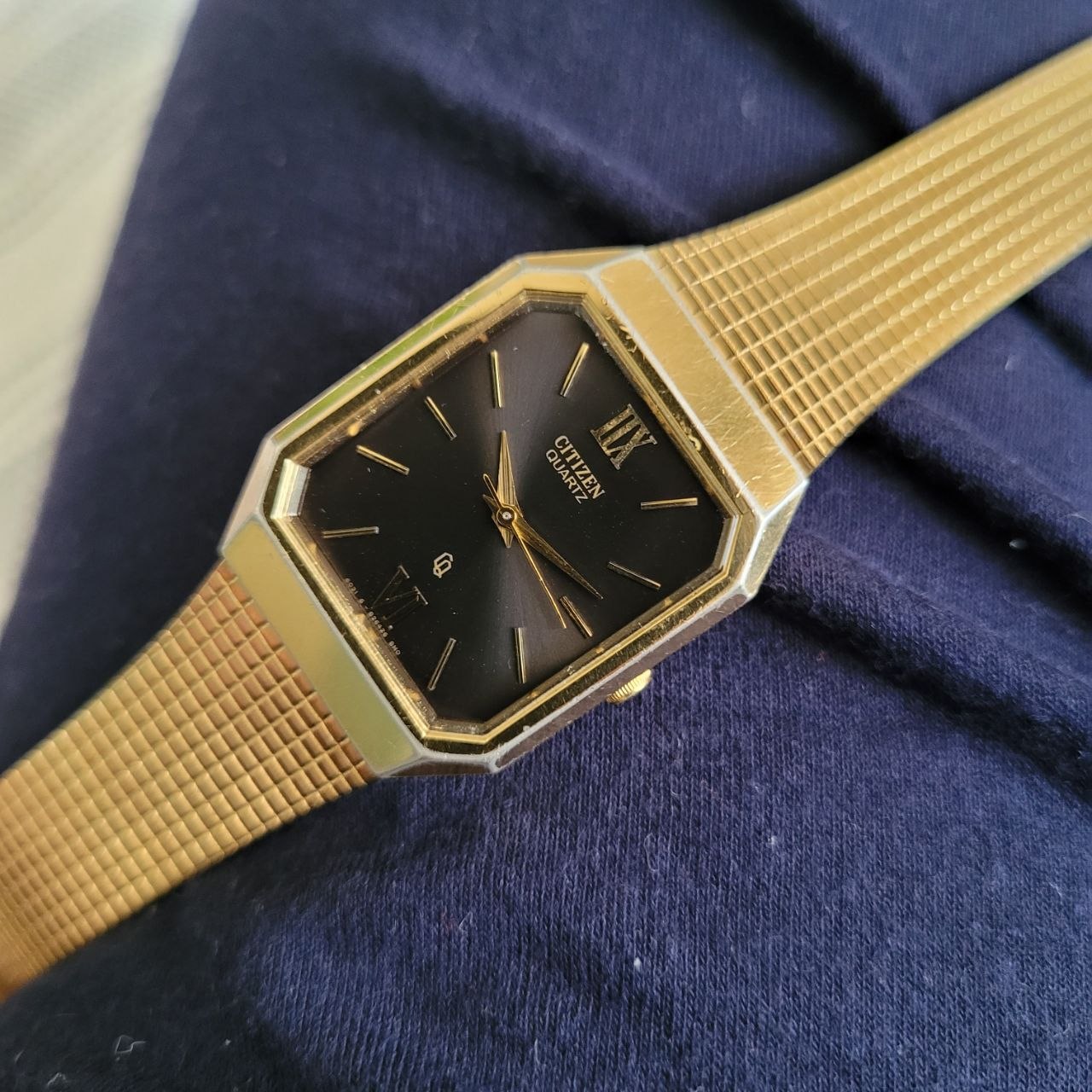 Relógio vintage original da marca Citizen, modelo Quartz, com elegante caixa dourada em formato retangular/octogonal, mostrador preto e pulseira metálica integrada com fecho assinado Citizen.