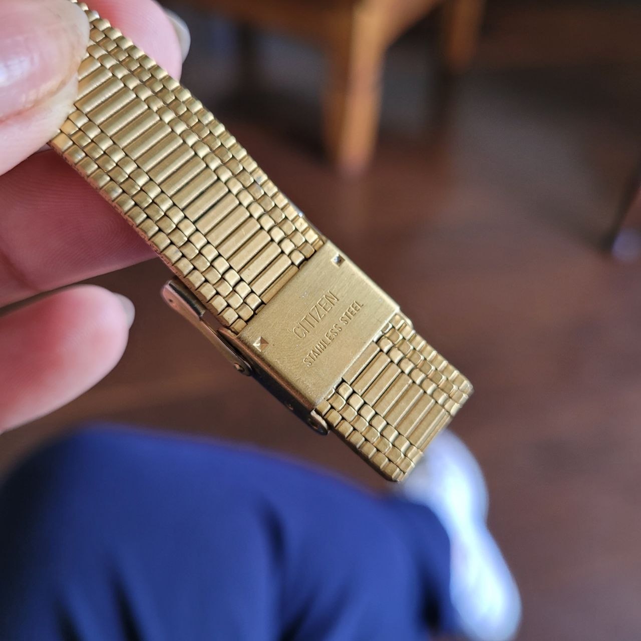 A pulseira metálica dourada acompanha o relógio e possui fecho assinado Citizen, detalhe importante para a originalidade da peça.