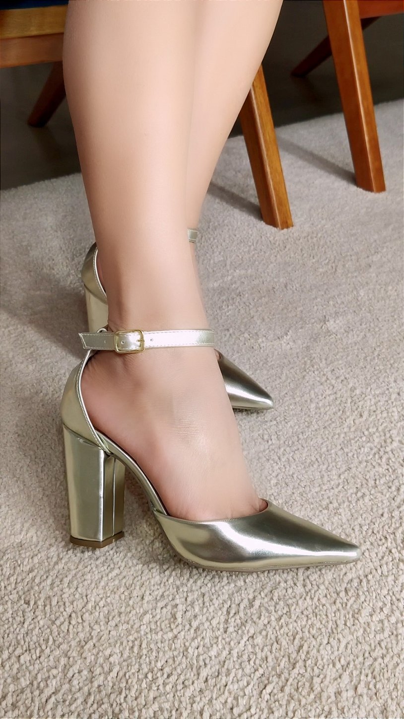 Salto: 9 cm de Altura encapado em Napa Metalizado Ouro Light;