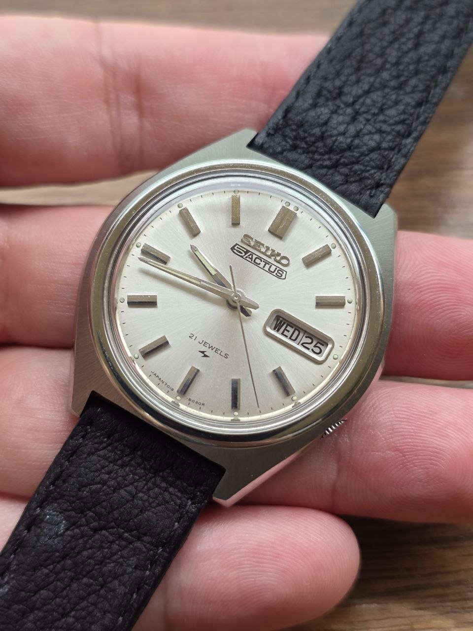 A linha Actus é conhecida pelo seu apelo visual marcante e por representar muito bem o estilo da relojoaria japonesa da época. Neste exemplar, isso aparece de forma clara: índices aplicados, dia e data em destaque, caixa angular de forte identidade e um conjunto muito harmonioso no pulso.