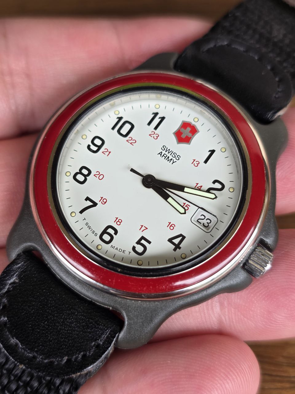 Numeração: Árabe preta com escala militar 13–24 em vermelho