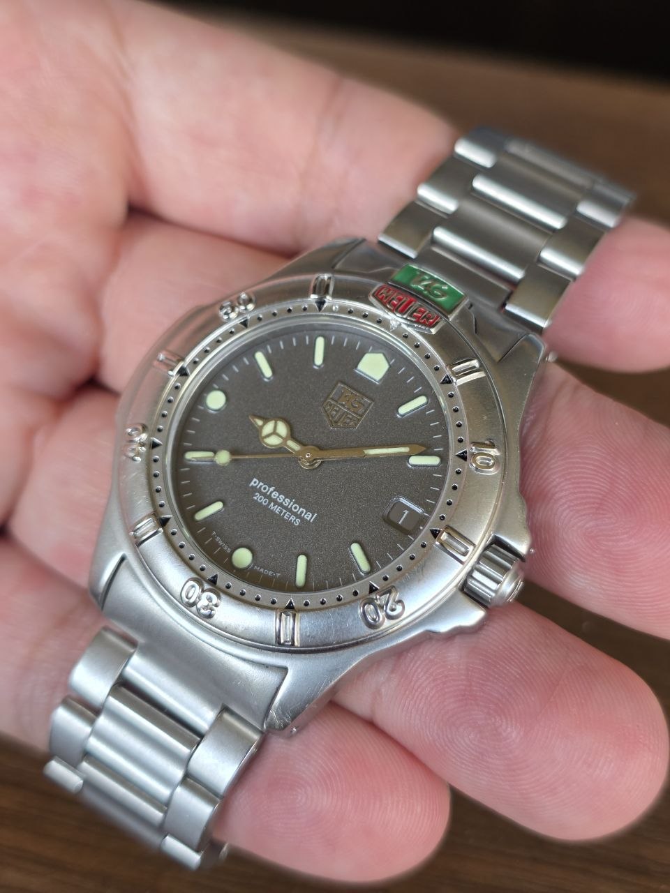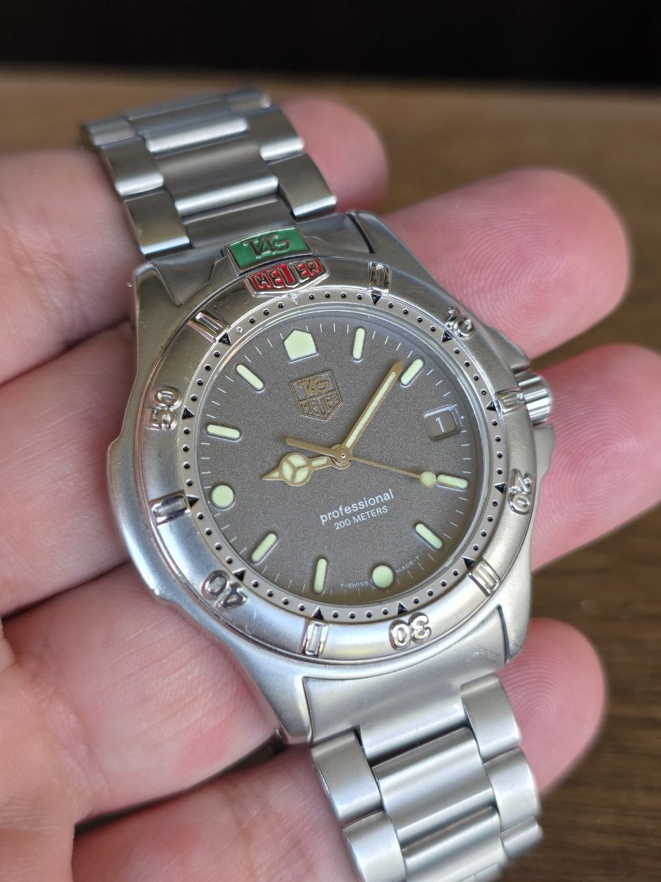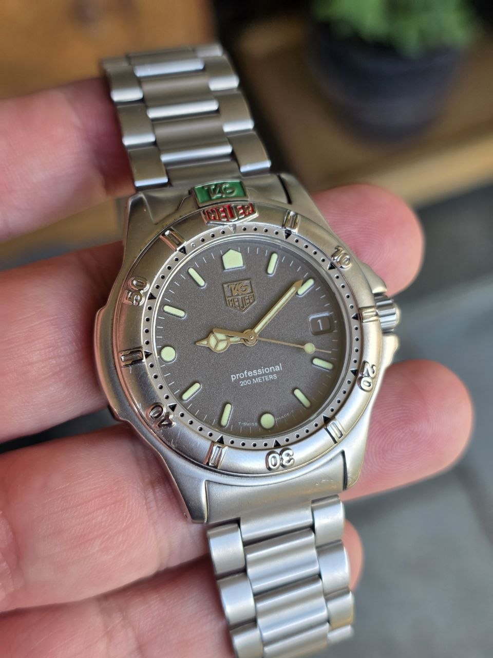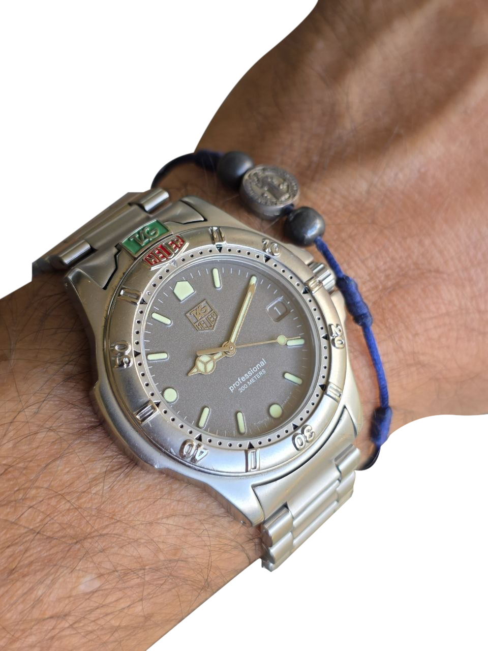 Relógio suíço clássico da TAG Heuer, conhecido entre colecionadores como TAG Heuer 4000 Series Professional 200m. Exemplar com visual marcante, mostrador cinza, pulseira em aço e construção típica da marca nos anos 90.