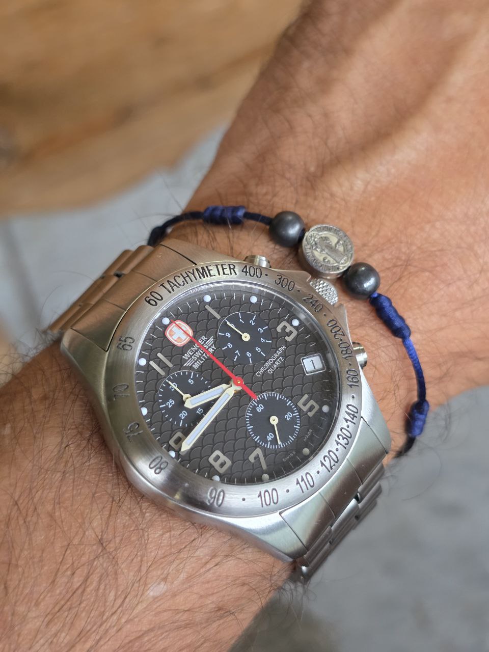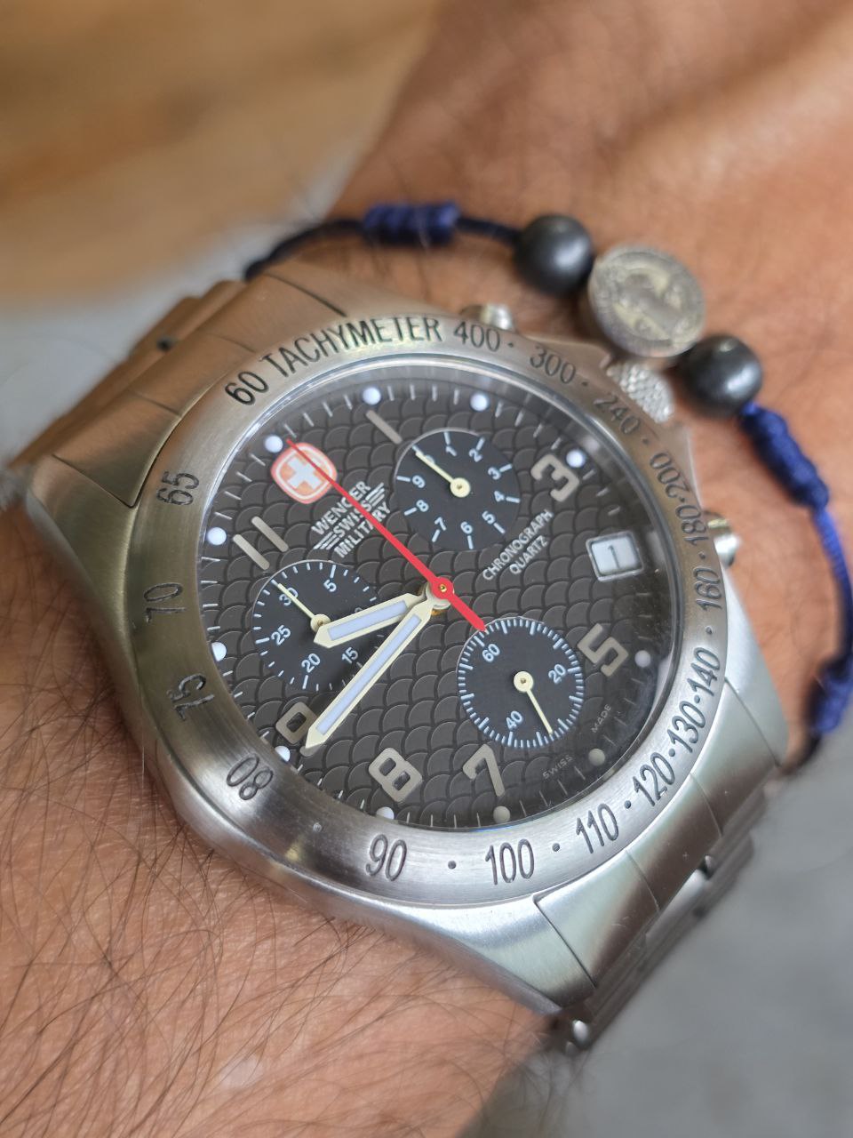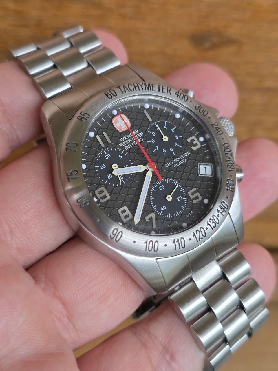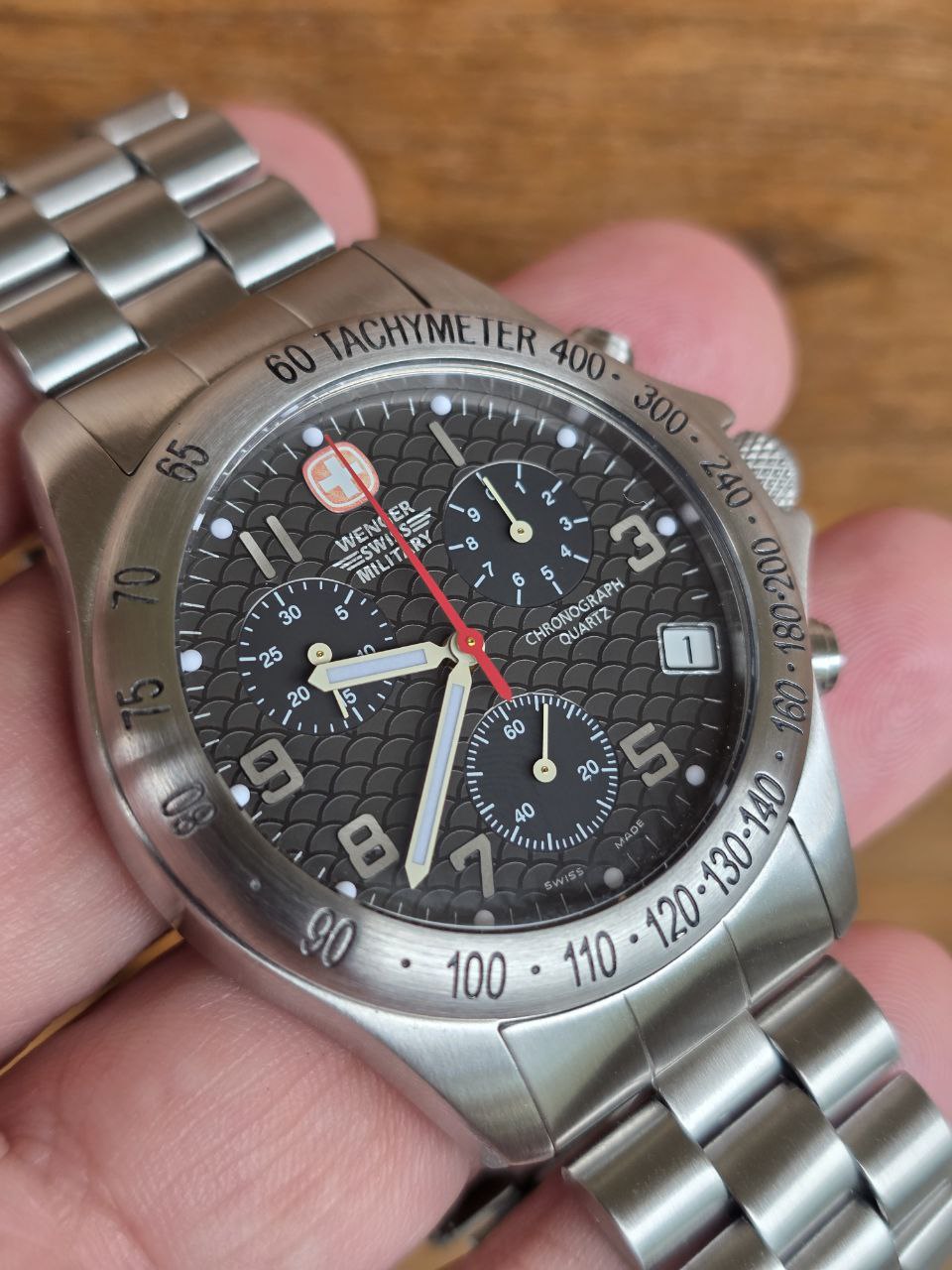 O design esportivo com taquímetro, mostrador bem equilibrado e proporções clássicas de 40mm fazem deste Wenger um modelo atemporal, cada vez mais difícil de encontrar em estado honesto como este.