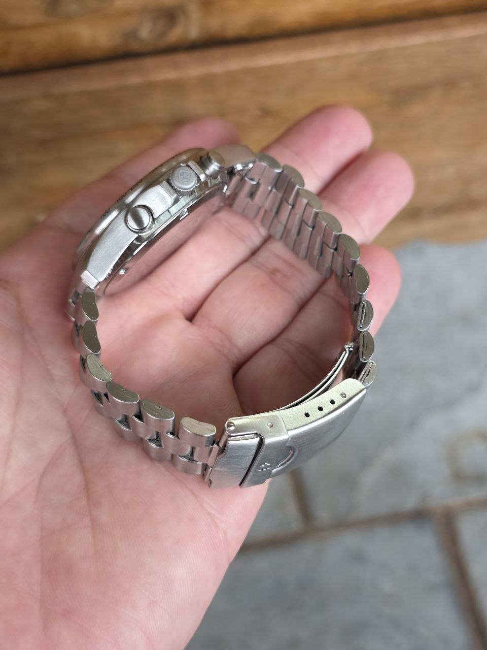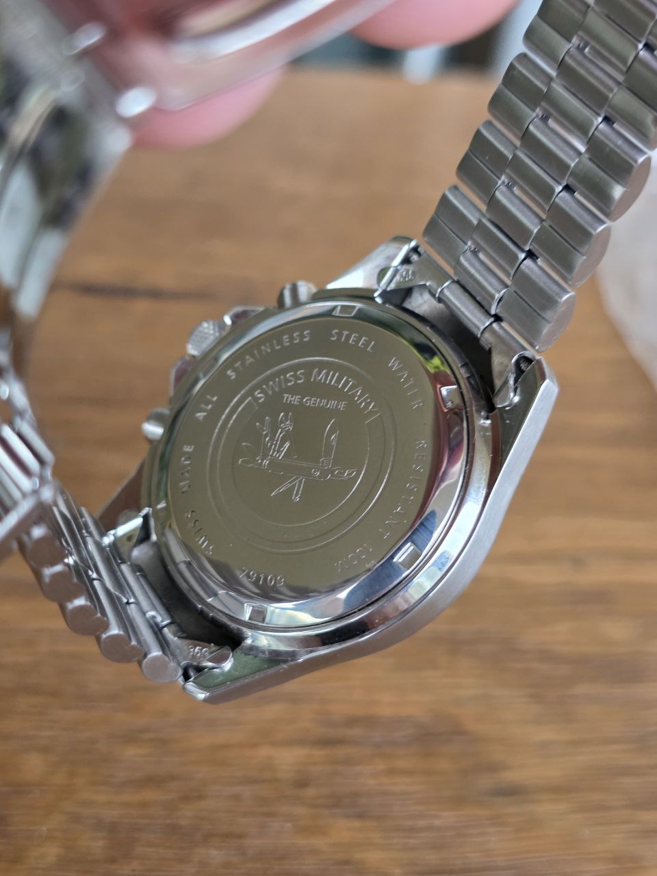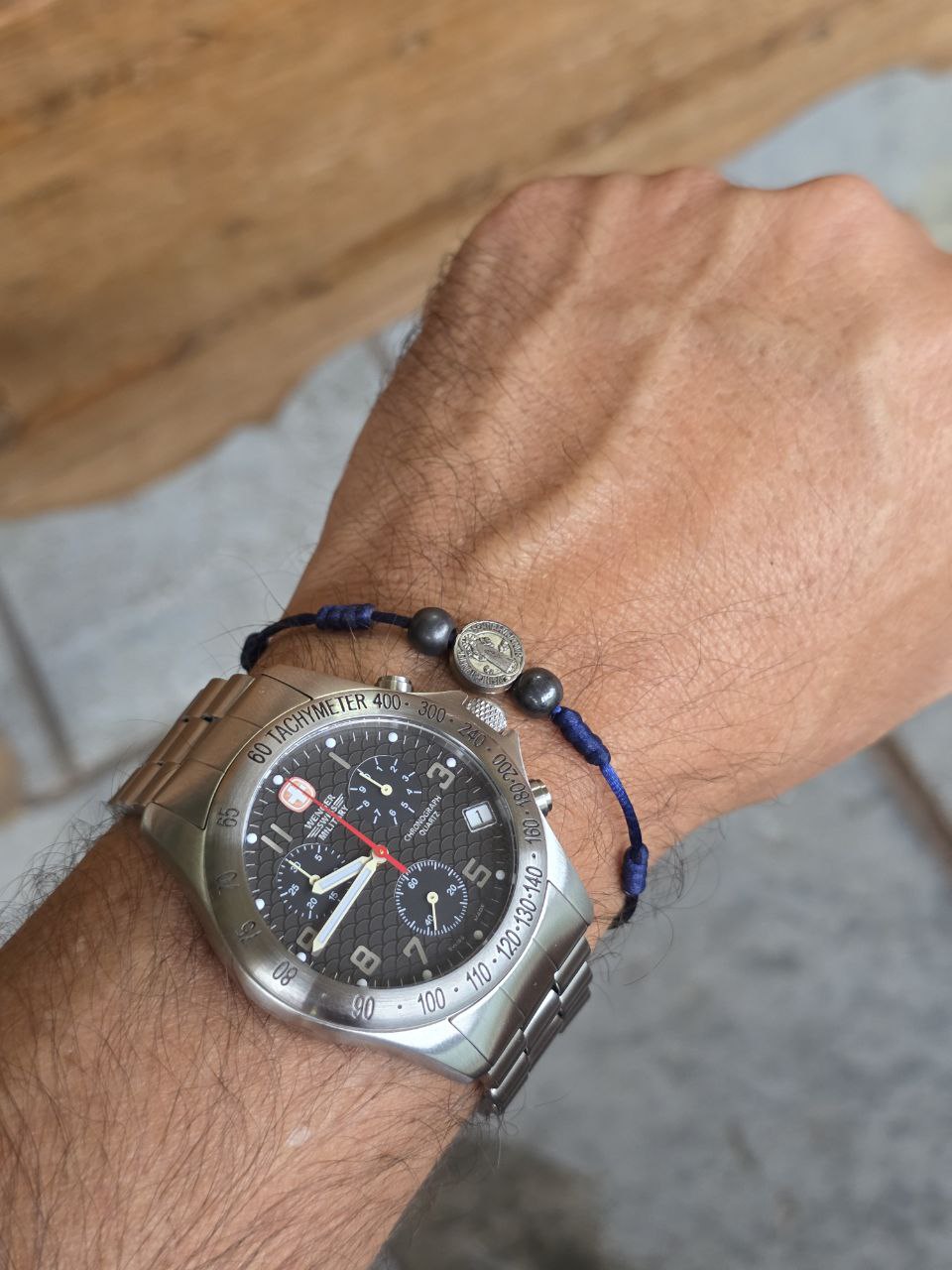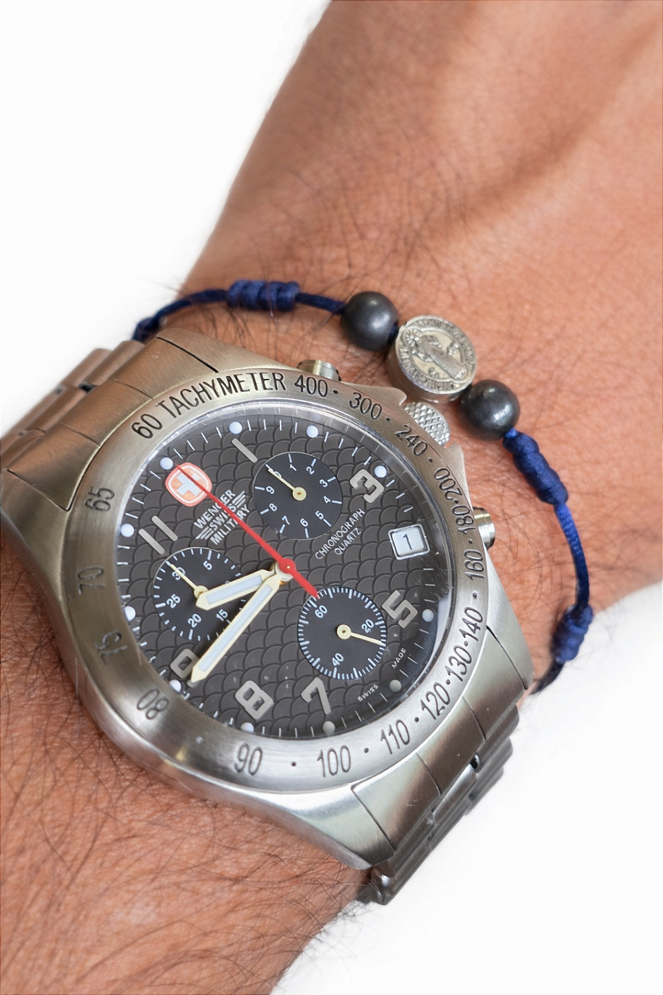 O design esportivo com taquímetro, mostrador bem equilibrado e proporções clássicas de 40mm fazem deste Wenger um modelo atemporal, cada vez mais difícil de encontrar em estado honesto como este.